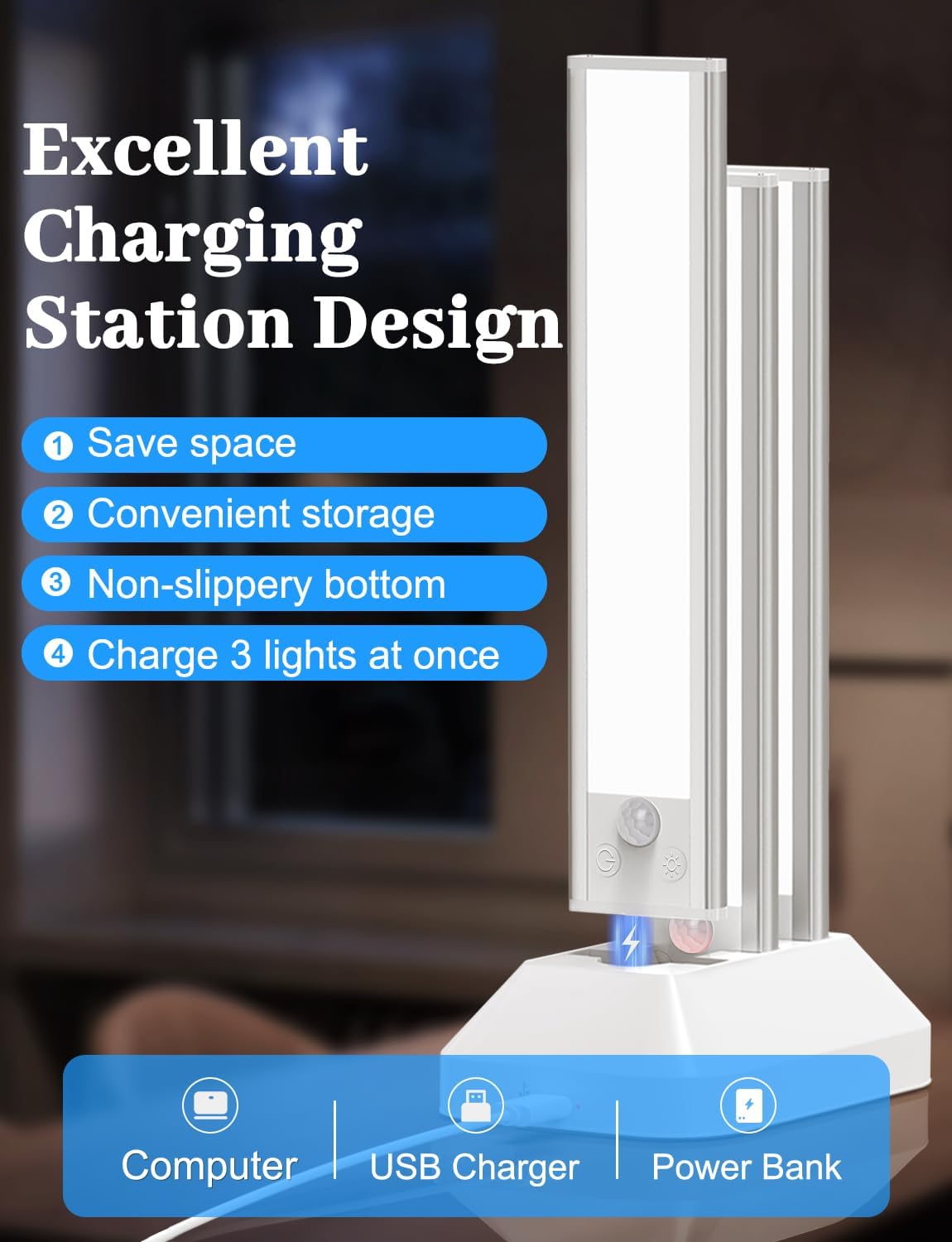 Storable 3-in-1 Charging Station: Tired of stray lamps and a nest of cables? This excellent multi-device charging dock can charge 3 wireless closet lights simultaneously or each one individually via USB-C. Unlike single-charge setups that create cable clutter, our under counter lights for kitchen enable convenient storage, saving space while eliminating cord clutter for a cleaner look. Plus, the secure anti-slip base prevents any tipping worries. Power your lights, declutter your life.