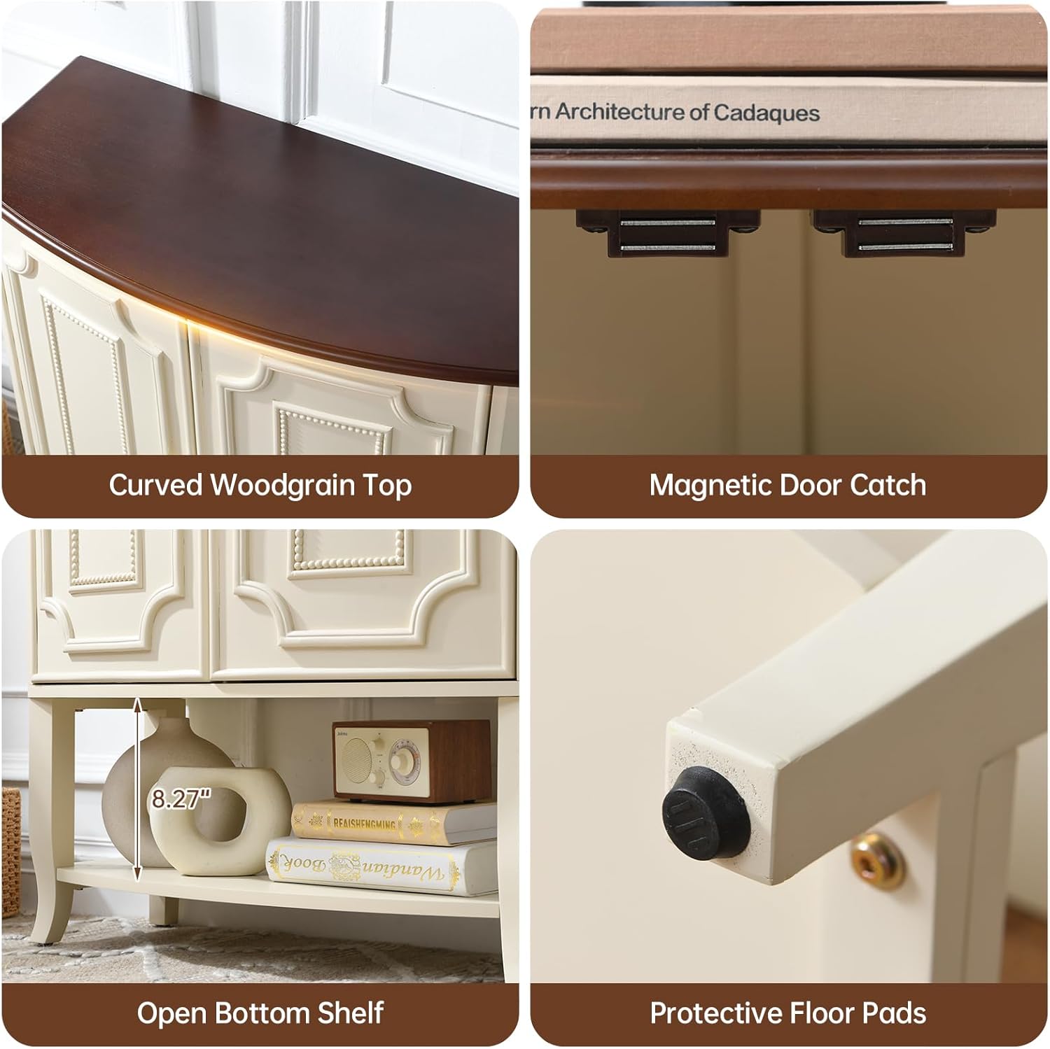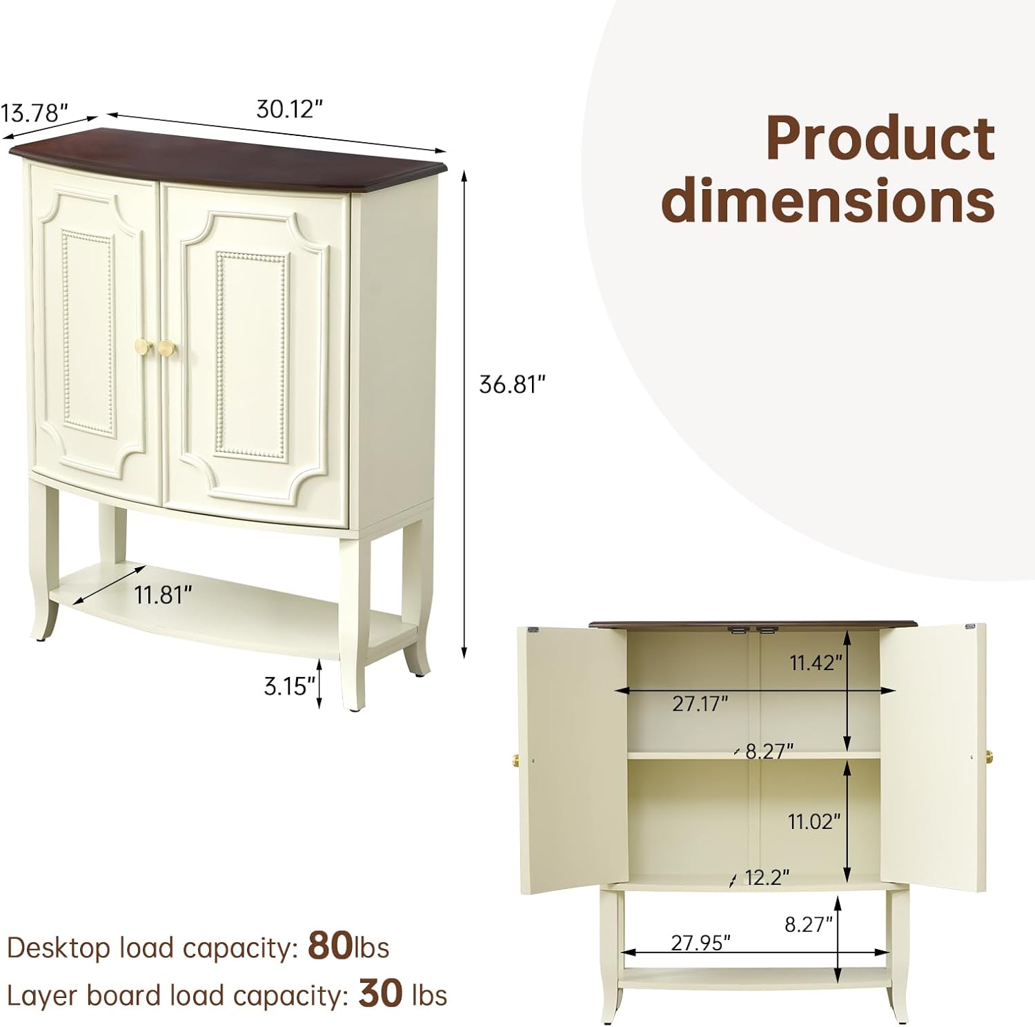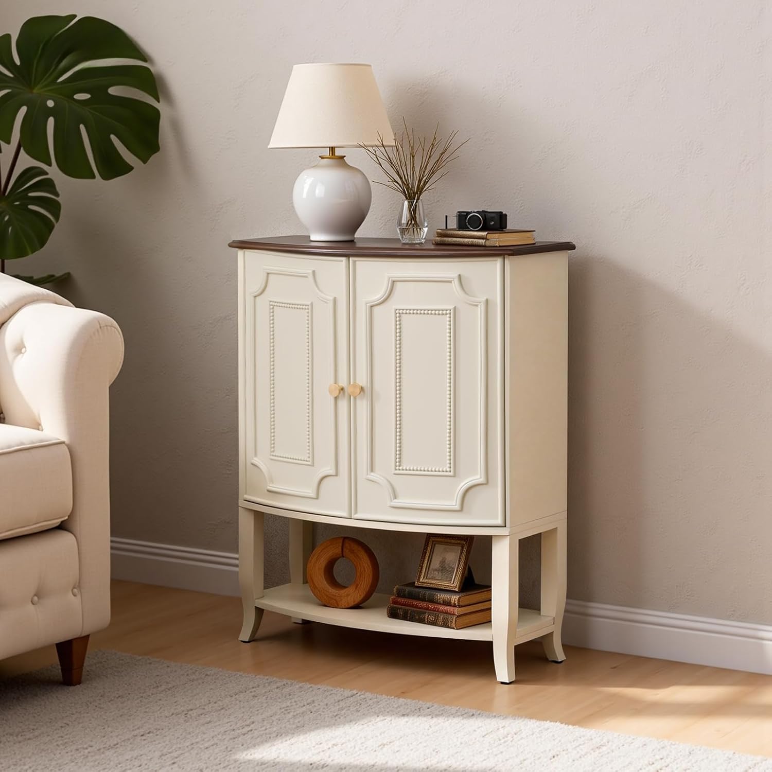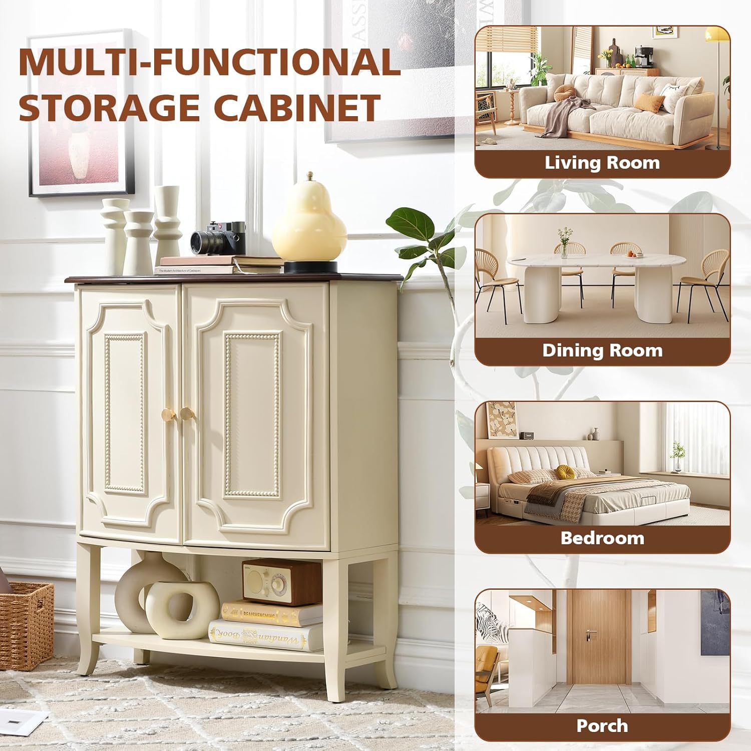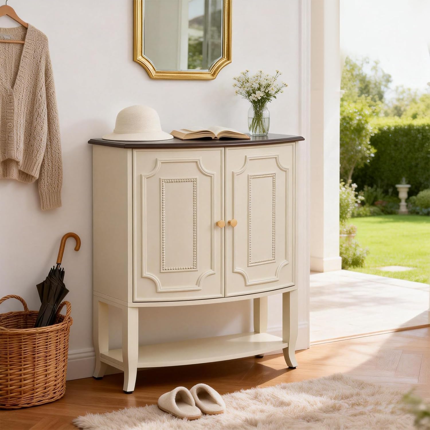 【Quality Materials, Two-Tone Look】Crafted with a sturdy MDF frame and a wood veneer tabletop, this cabinet features a smooth lacquered surface that’s easy to clean and designed for everyday use. The soft cream body paired with a warm wood-look top creates a classic two-tone finish that complements vintage, modern traditional, or cottage-style interiors.