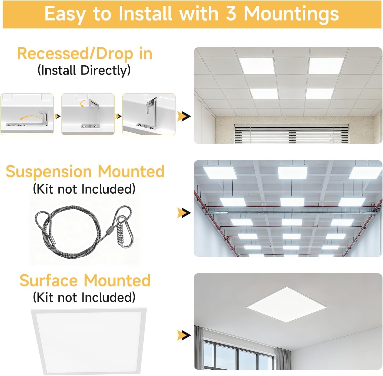 【Multiple Installation Methods】2×4 Led Flat Panel Light supports recessed mounted,surface mounted(kit not included) and suspension mounted(kit not included).LED panel lights are designed for commercial and residential ceilings,suitable for kitchens,living rooms,showrooms,offices,schools,and retail locations.