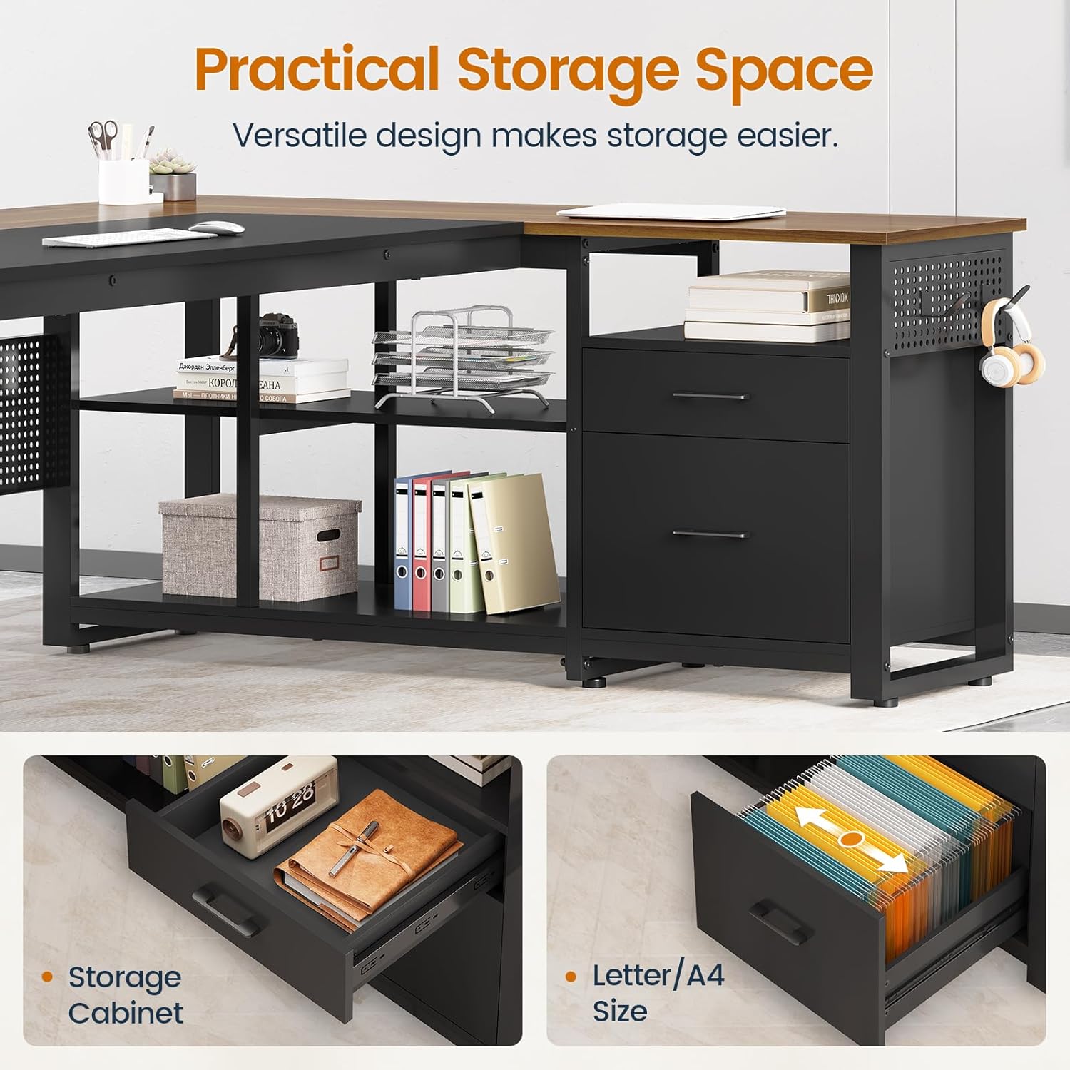 【Ample Storage Space】The decent layout L shaped computer desk provides a variety of storage space, including a storage cabinet, printer space, pegboard, storage shelves and hooks. The larger file drawer is ideal for Letter or A4 size documents, while small drawer and open shelves are great for storing odds and ends.