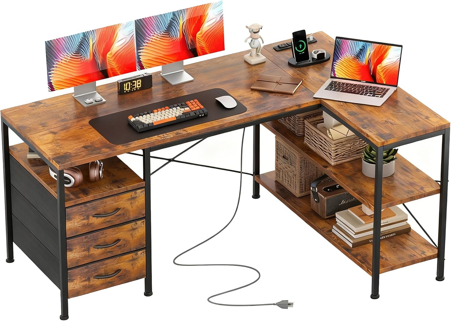 【Versatile Storage Solutions】 Keep essentials organized with 3 durable fabric drawers, each holding up to 22 lbs—ideal for files, notebooks, or supplies. The L-shaped computer desk also features adjustable open shelves for books, décor, or a CPU tower, reducing clutter and keeping items within easy reach.