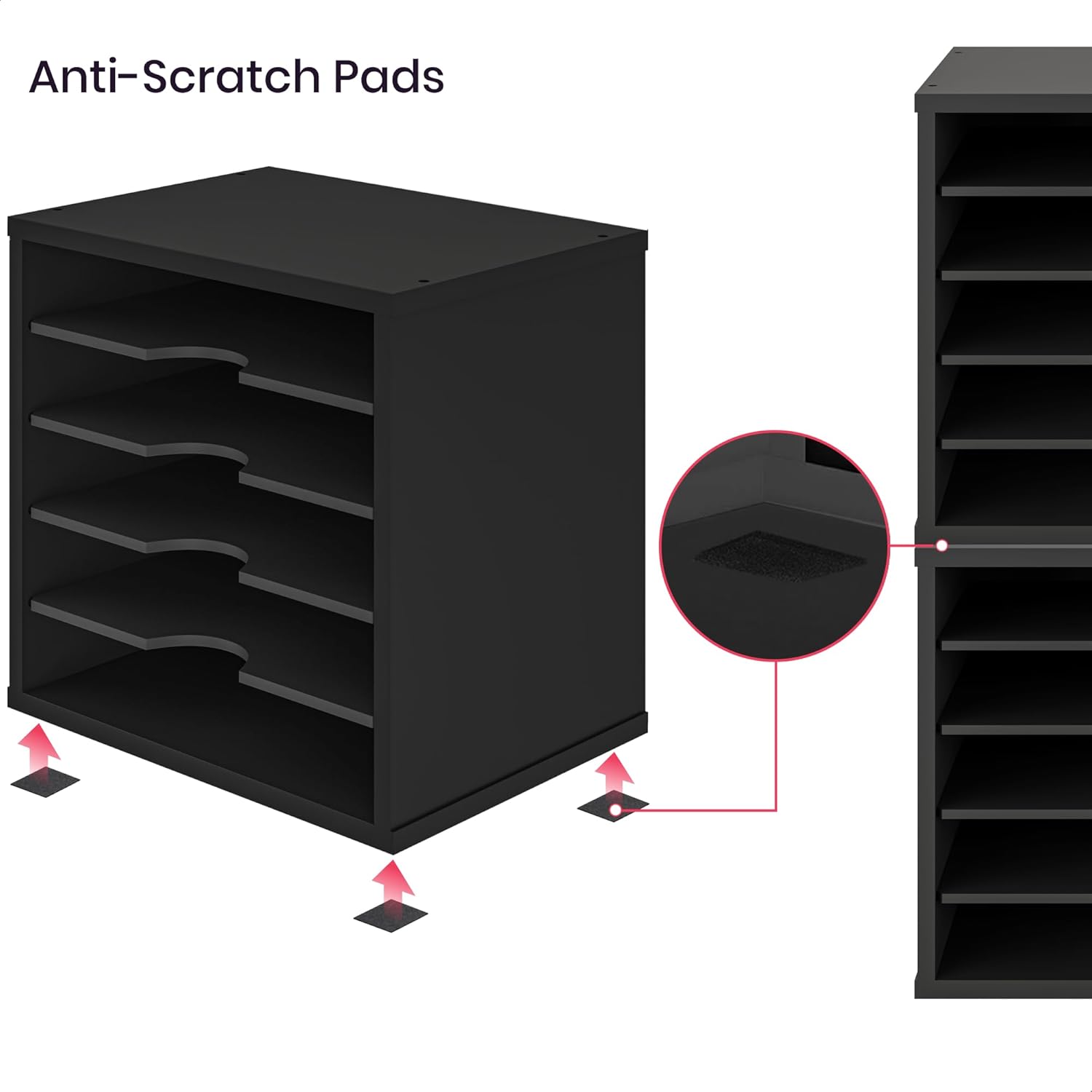Adjustable shelves can be removed during assembly to allow for storage of larger items likes books, speakers, large headphones and more.Curved cutout design of the shelves makes picking the files, letters, and books easier. Great for keeping desktop neat and organized.Non-slip felt feet provided to reduce movement and protect your work surface from scratches and scuffs.