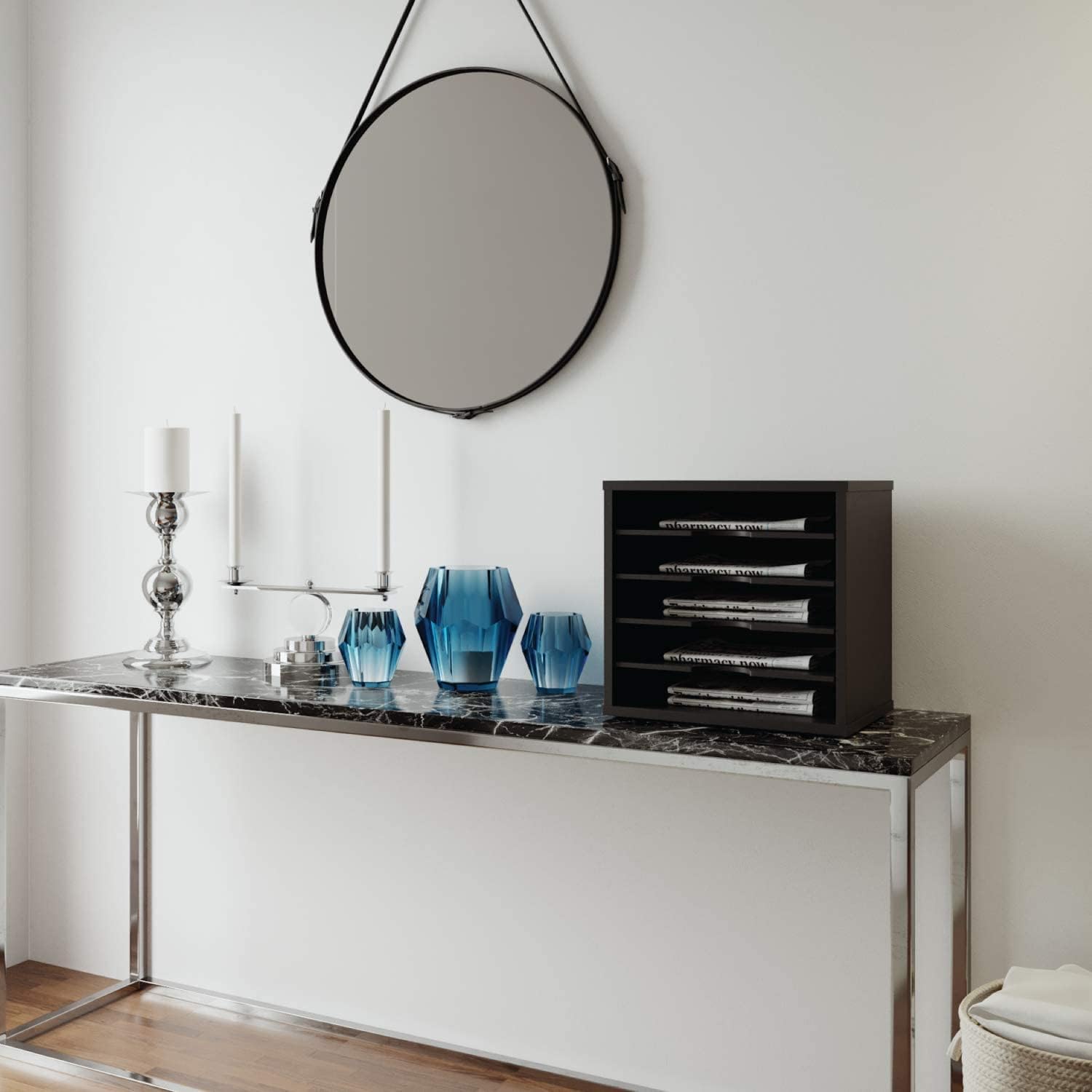 ORGANIZER: This black paper organizer features 5 storage spaces, so it has ample room for sorting mail and storing books, folders, magazines, craft papers, files, and more
