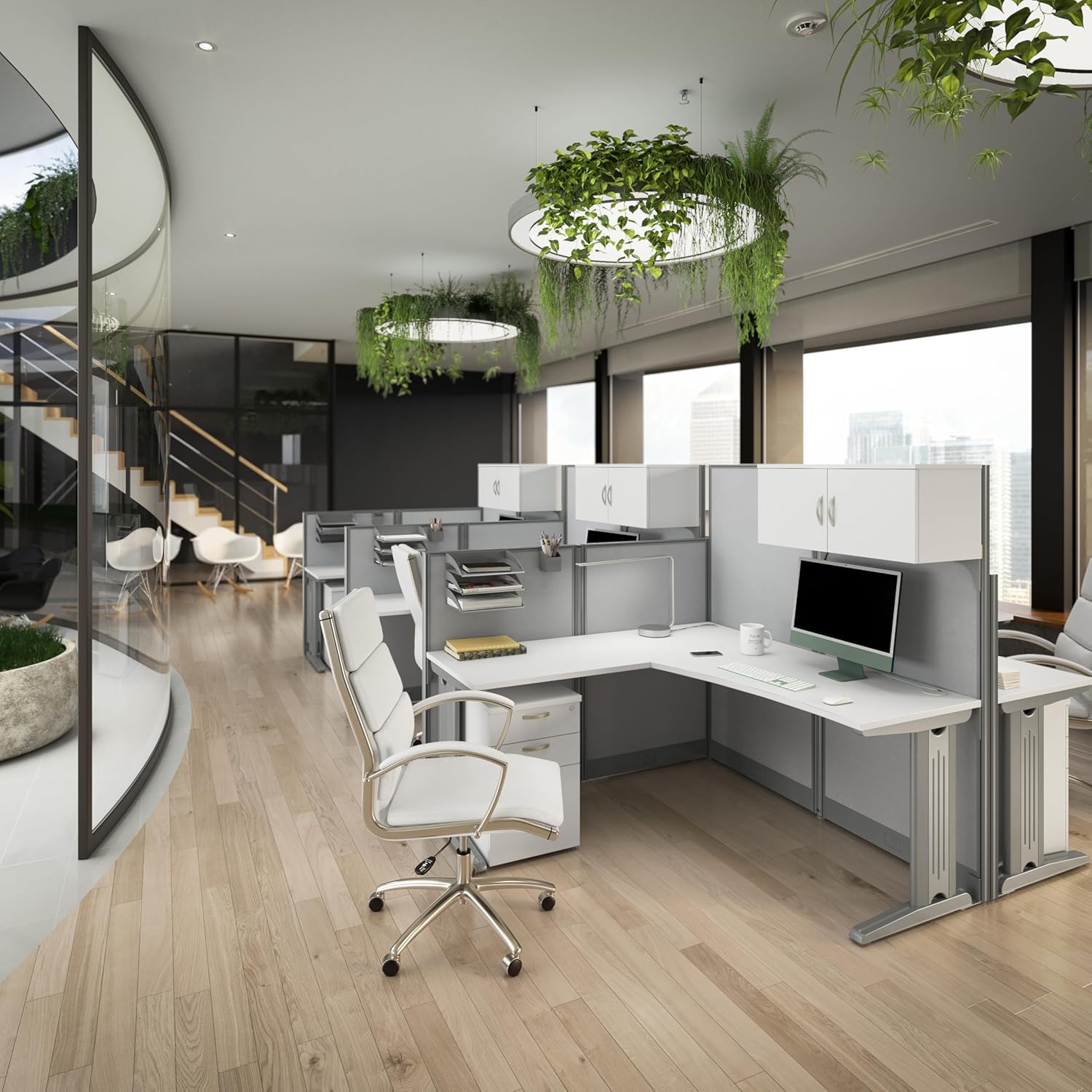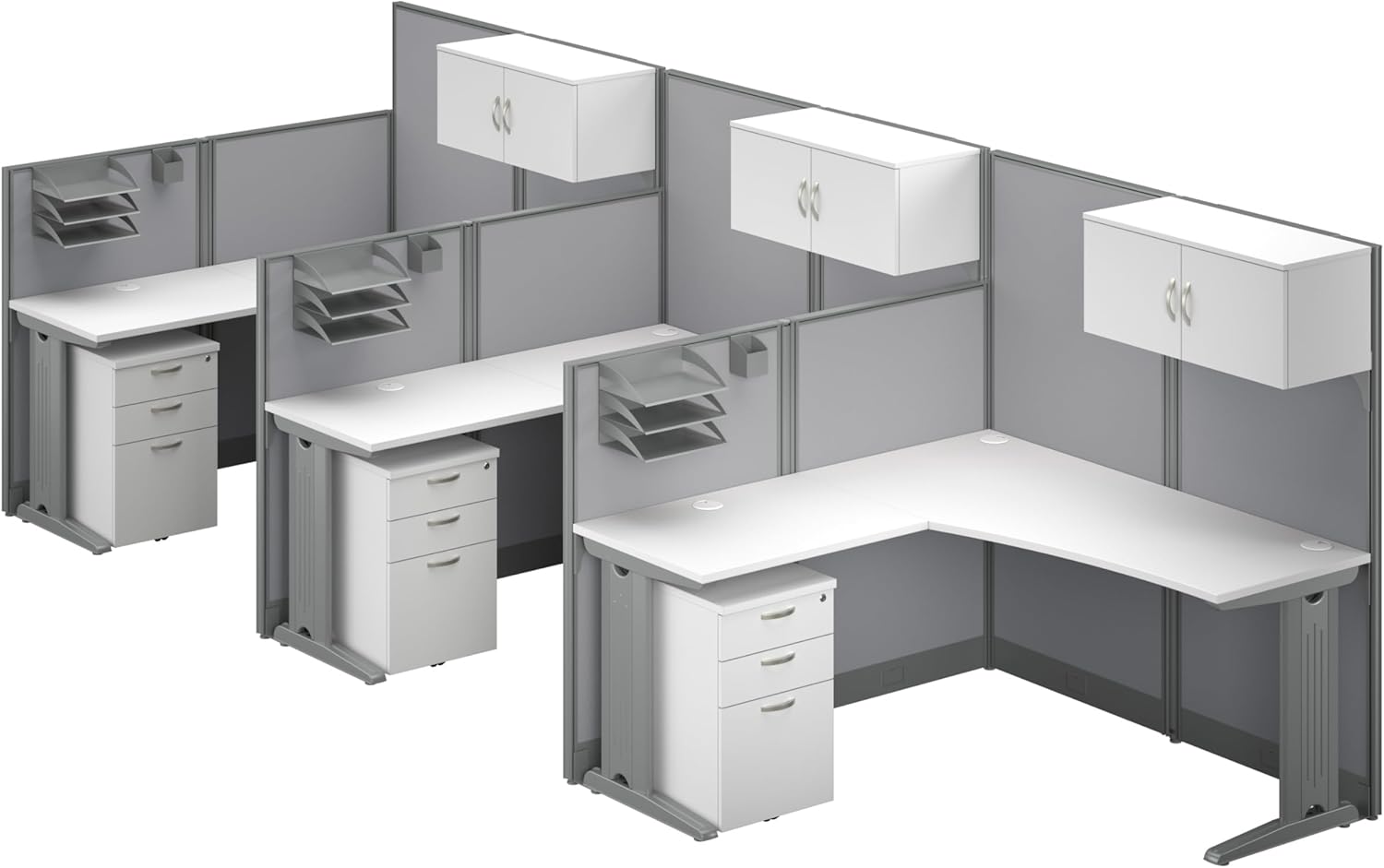A QUICK AND EASY SOLUTION: The Office in an Hour Collection is a convenient way to turn empty space into a practical workstation. This 3 Person L Shaped Cubicle Desk Set is easy to order and install so you can get your workplace up and running instantly.