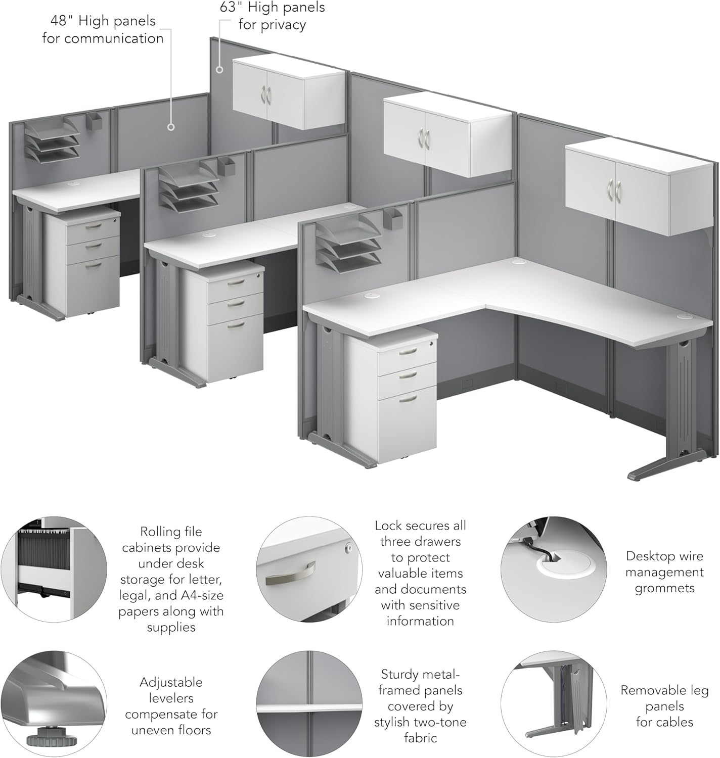 Bush Business Furniture’s Office in an Hour Collection is an ideal solution for converting empty space into a practical and productive work environment. Designed with convenience in mind, this 3 Person L Shaped Cubicle Desk with Storage Set is simple to order and install so you can get your workplace up and running instantly. The commercial office desks support up to 200 pounds while their thermally fused laminate finish protects against scratches, stains, and other cosmetic damage. Desktop grommets and removable leg panels keep cords and cables in order to maintain a neat workstation. Each L shaped computer desk has a 63H panel for privacy and a 48H panel for communication; panels can be installed on either side for a custom layout. The Mobile File Cabinets’ locking drawers hold letter, legal, and A4-size files along with supplies and personal items. Dual-wheeled casters move the rolling file cabinets wherever organization is needed, including beneath the work surfaces for under desk storage. Storage Cabinets mount to either side of the tall cubicle panels for easy access to books, manuals, and other materials. Paper Trays and Pencil Holders organize work-in-progress and writing utensils so you can access supplies without breaking focus.