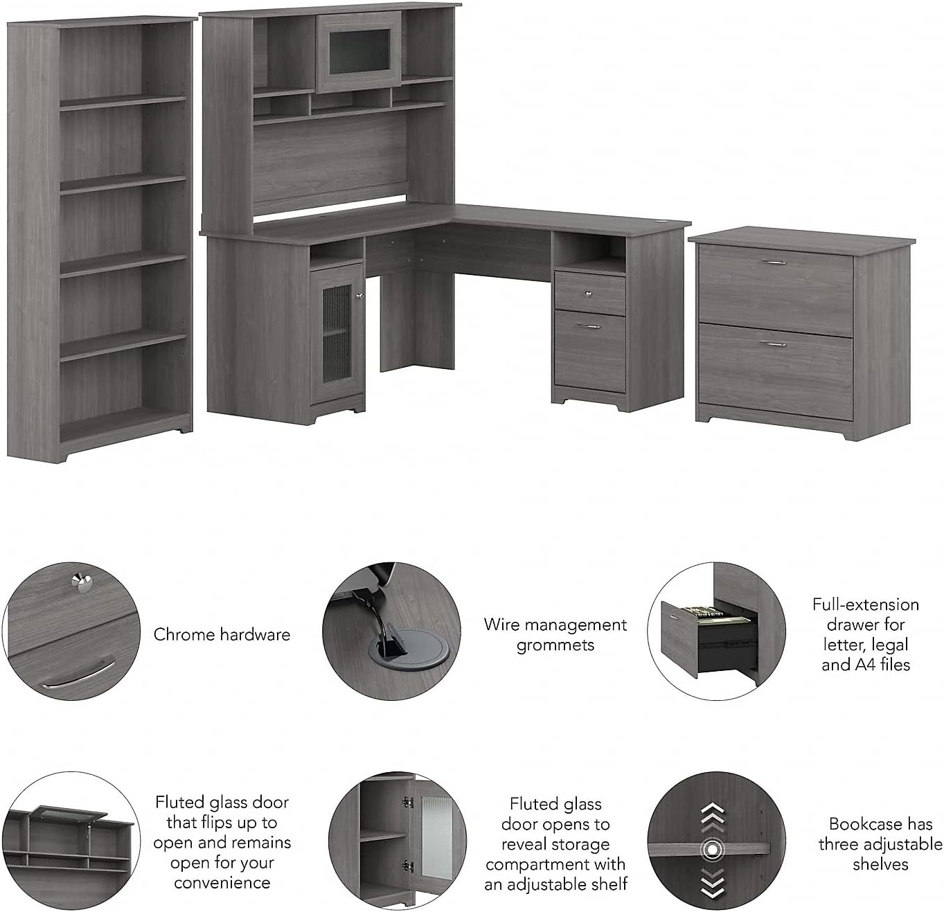 WORKSPACES MADE STYLISH: Spread out and maximize your work efforts with Bush Furniture’s Corner Desk with Hutch, Bookcase and Filing Cabinet. Our L desk with hutch offers ample work space while combining open and closed shelving for storage and display.