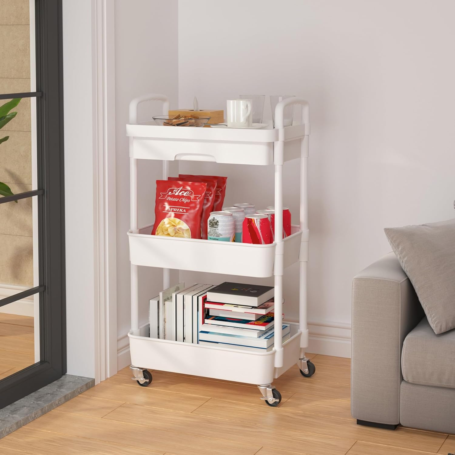 Large size can more reasonably plan your space. The Rolling Cart in the living room can hold books, snacks and other small items, which is convenient to pick up when you use it.