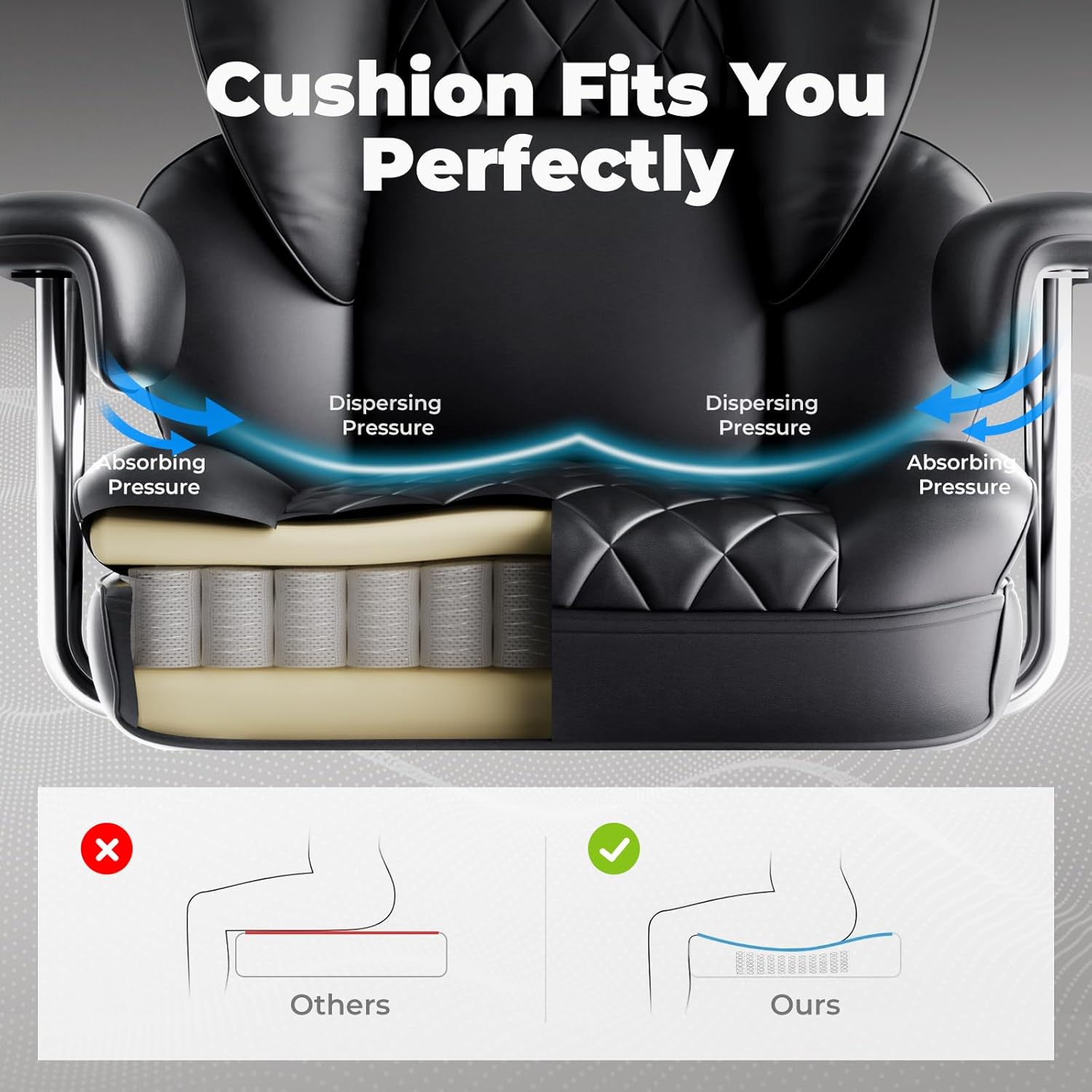 【Ergonomic Full-Body Design】Specifically designed for pressure dispersion and body support, the backrest features 3D wrapping lumbar support with dual-layered high-density foam and high-loft fiber, conforming to the curves of your neck, shoulders, and back. The oversized adjustable lumbar pillow provides personalized support, delivering a sofa-like embracing comfort.