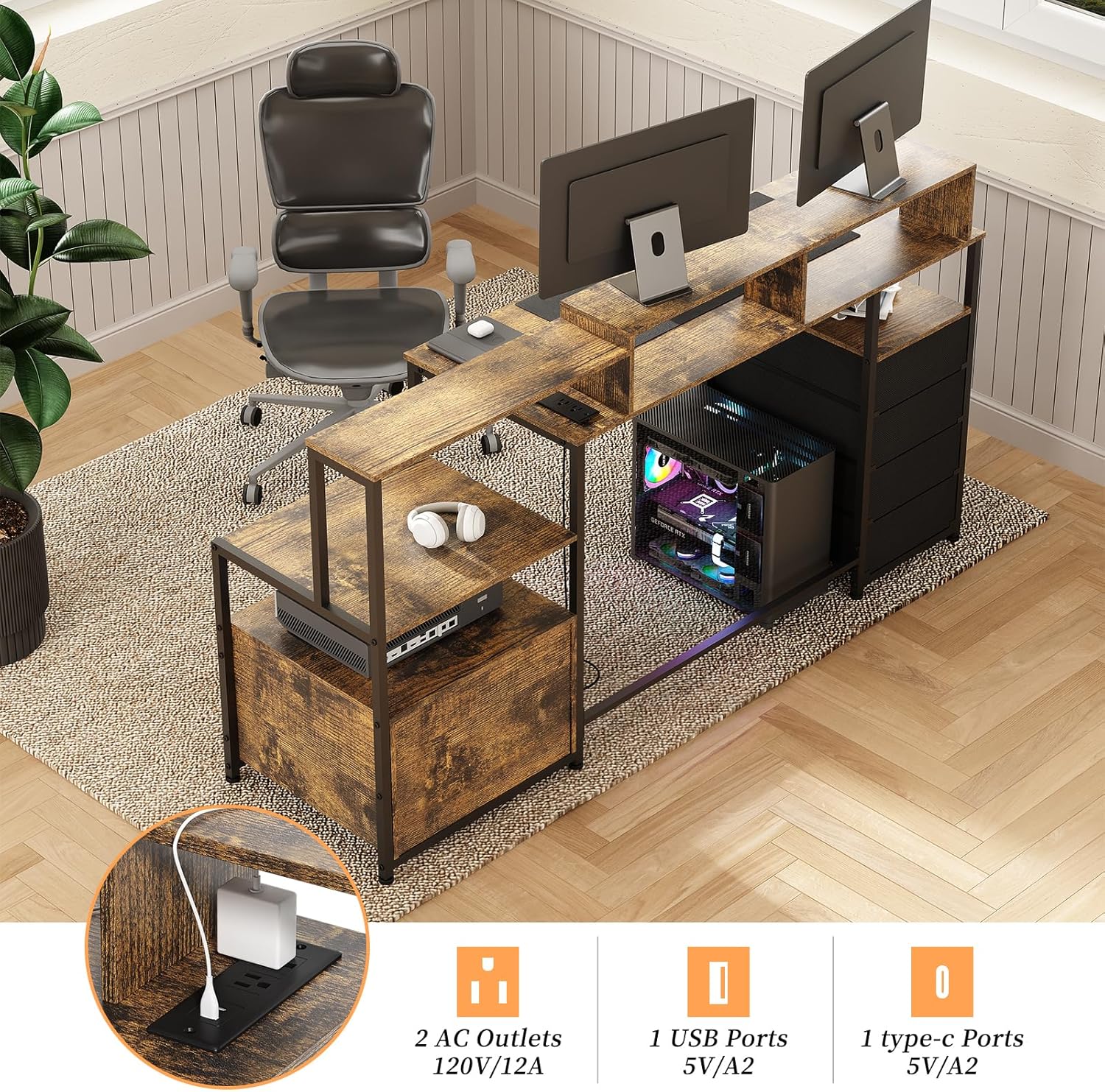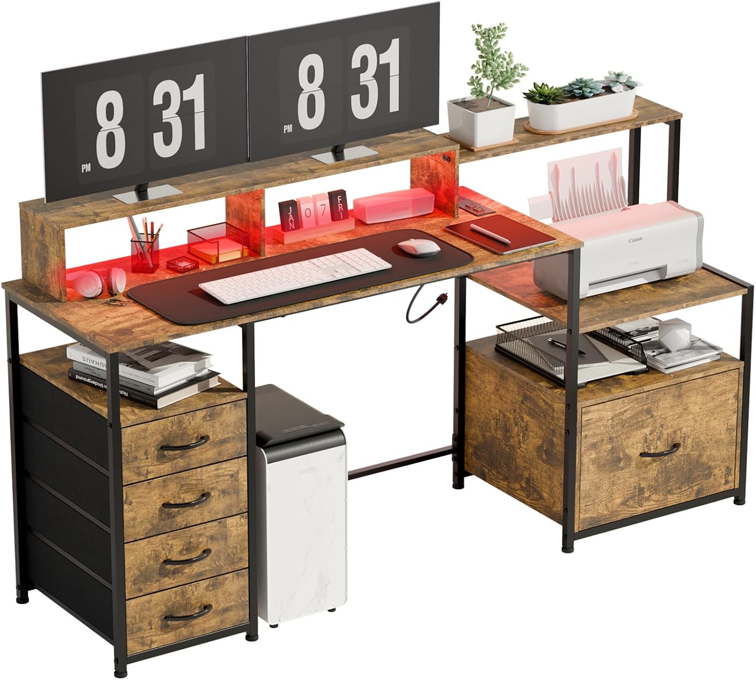 Computer Desk with Drawers: Get the perfect workspace! This 67″L×18.1″W×29.5″H study table boosts productivity. It has 1 file drawer, 4 fabric drawers, and an open shelf for ample storage. Office items and game accessories can be stored neatly. The dedicated printer racks let you place printers within easy reach. The combination of drawers and shelves keeps your desk clutter – free and efficient for work or gaming