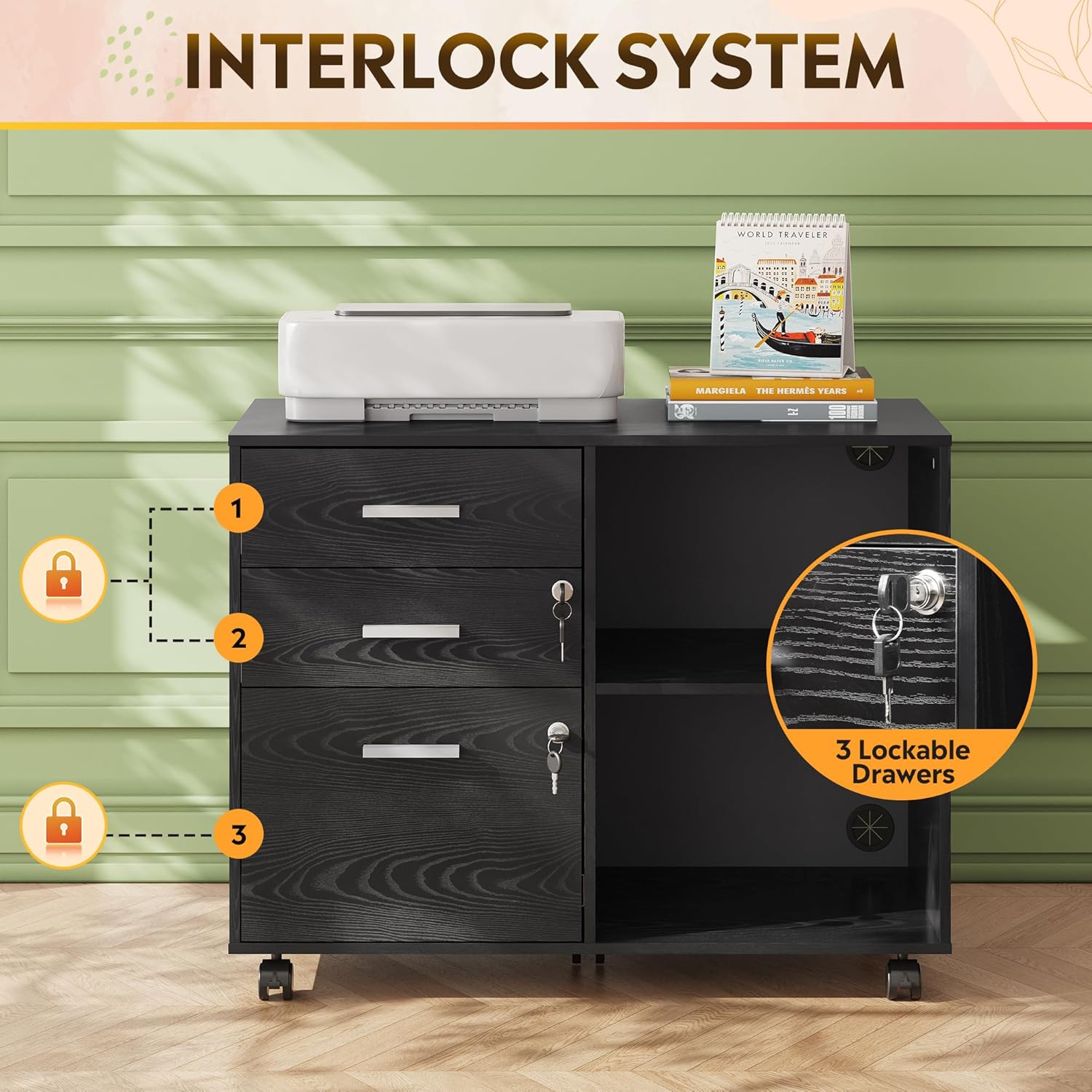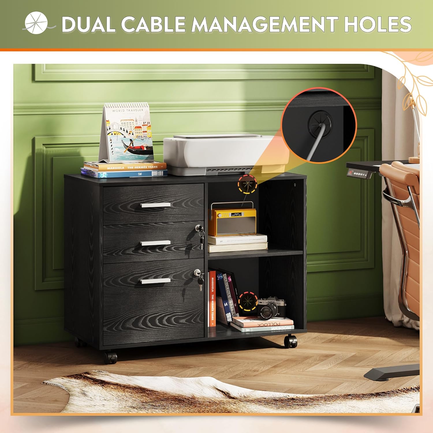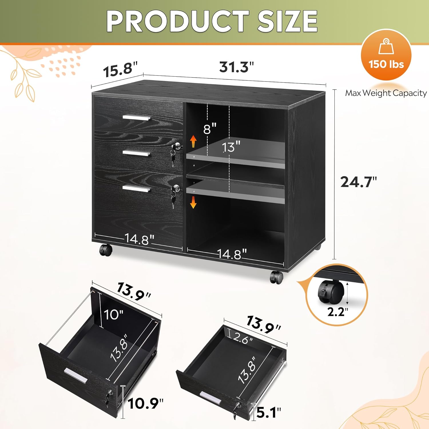 Multifunctional File Cabinet with Lock: This file cabinet features open storage spaces, file drawers, and storage cabinets, allowing you to organize office equipment, papers, files, and supplies neatly. It is equipped with 2 locks, identifying 3 lockable drawers to keep your personal belongings secure.