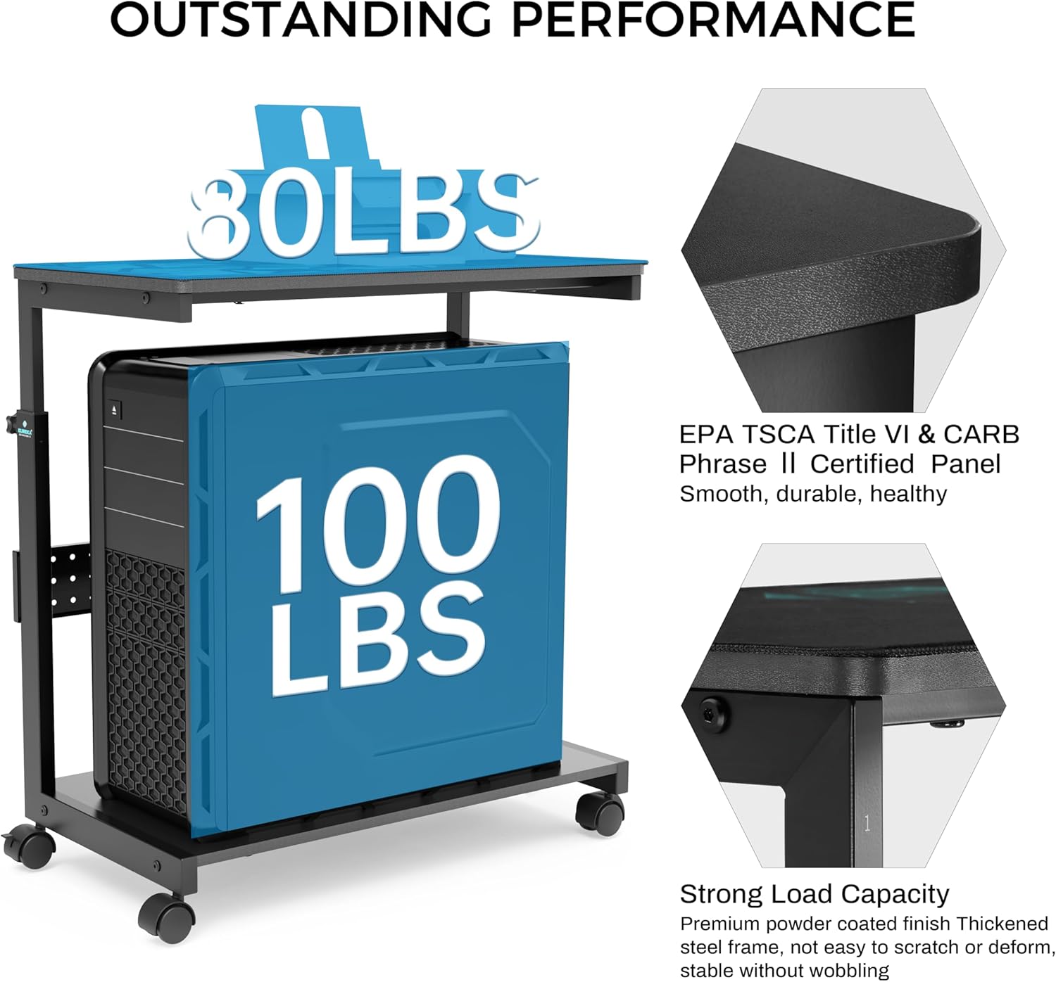 Sturdy Structure: EPA TSCA Title VI & CARB Phase Ⅱ Certified desktop panel with premium anti-scratch finish. Thickened steel frame with powder-coated finish resists corrosion to ensure stability and durability, is not easy to scratch or deform, no wobbling. The bottom shelf max weight is up to 100 LBS, the top shelf is 80 LBS. NOTE: When moving, the cpu stand can only support up to 80 LBS.