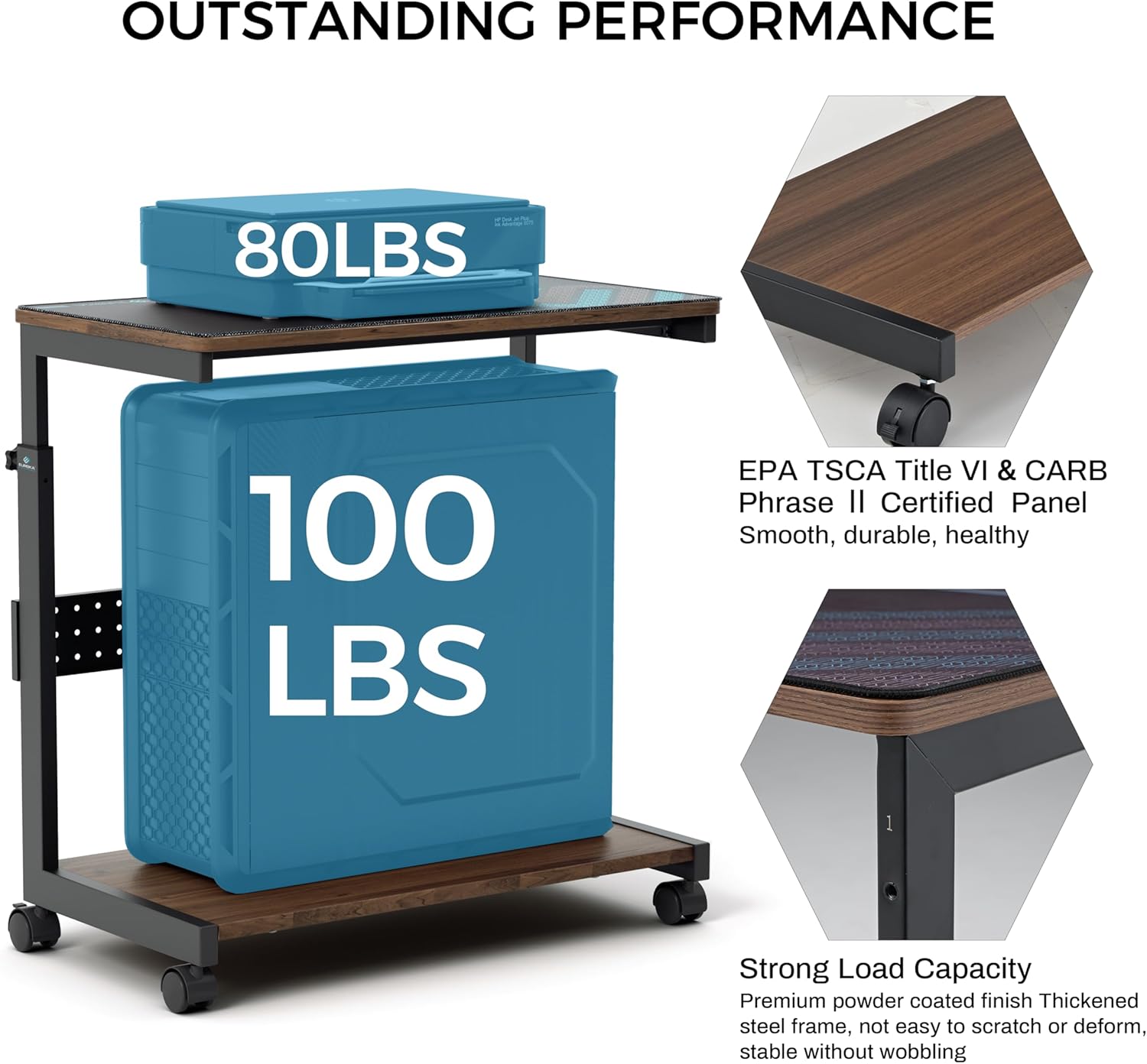 Sturdy Structure: EPA TSCA Title VI & CARB Phrase Ⅱ Certified desktop panel with premium anti-scratch finish. Thickened steel frame with powder-coated finish resists corruption to ensure stability and durability, not easy to scratch or deform, no wobbling. The bottom shelf max weight up to 100LBS, top shelf is 80 LBS. NOTE: When moving, the computer tower stand can only supports up to 80 LBS