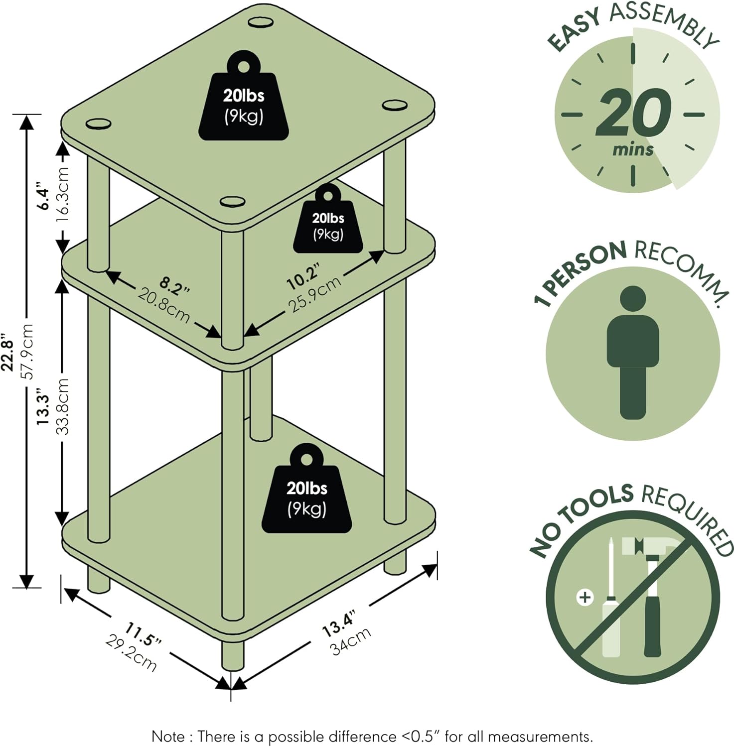 WEIGHT CAPACITY: Each shelf of this end table/ nightstand holds up to 20 lbs (9 kg); total unit supports up to 60 lbs (27.2 kg)