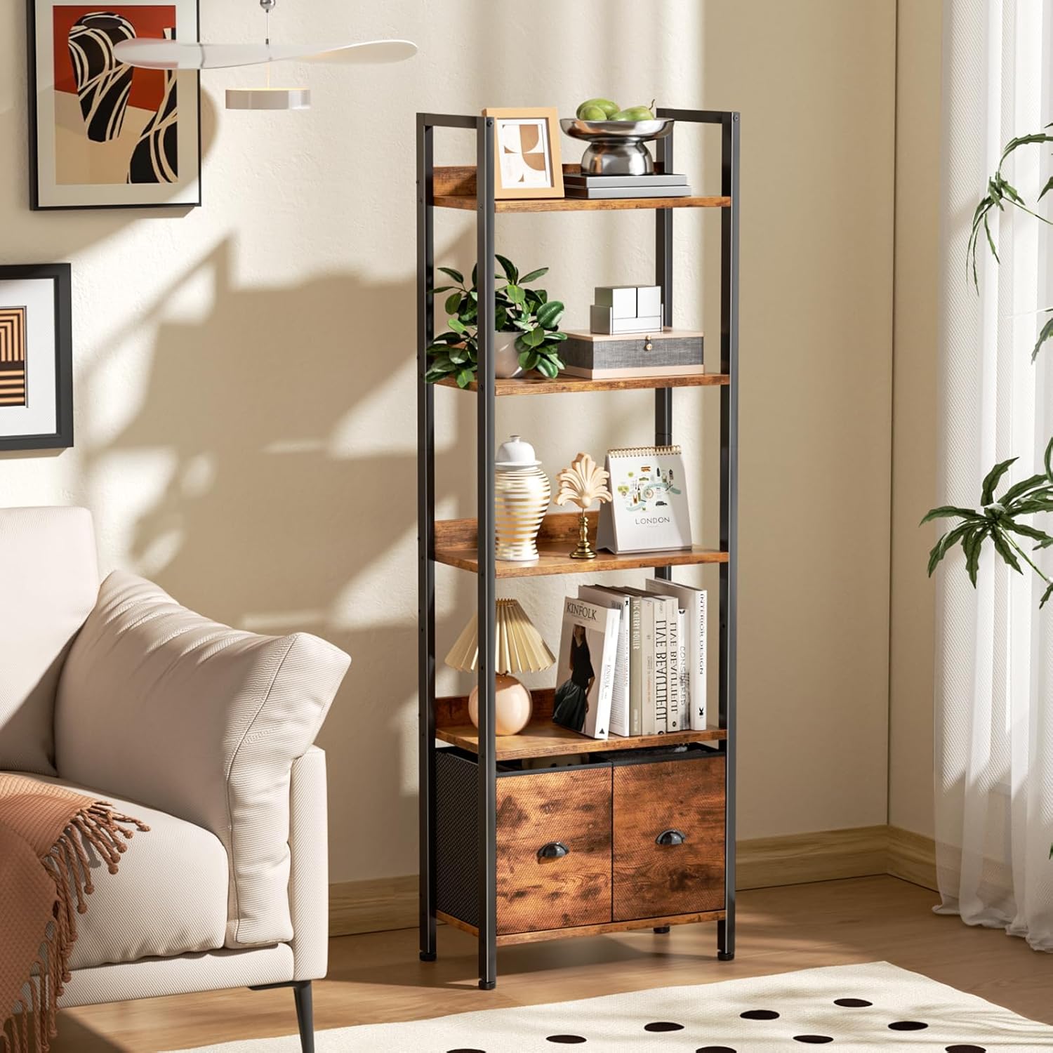 [Flexible 5-Tier Bookshelf]: This open bookcase has 5-tier shelves, providing plenty of storage space to display your favorite books, family photos, crafts or potted plants, etc. Perfect to store or display your necessities and decorations. Considering that you may need to store large products, you can adjust the middle tier shelf to achieve it.