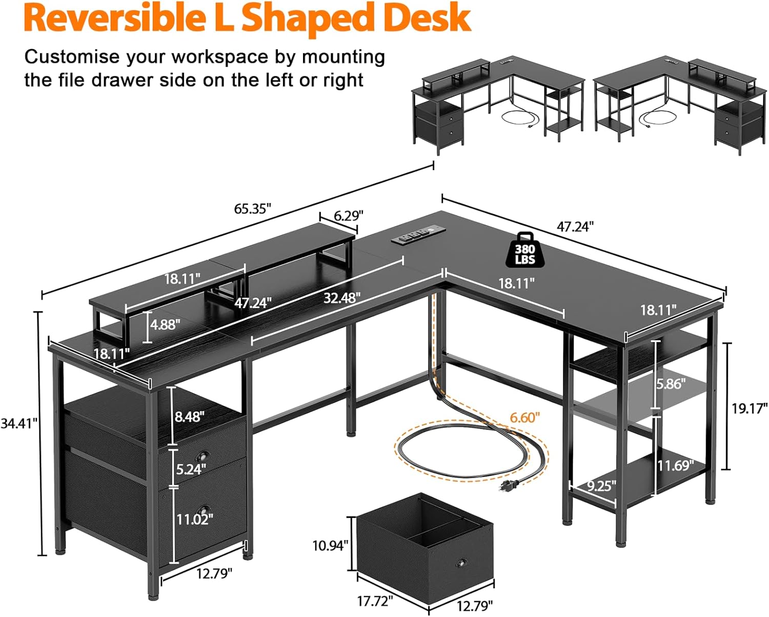Upgraded Fabric File Drawer: The l shaped desk with a fabric drawer and file cabinet, 2 tier storage shelves, allowing you hold letter/A4/ legal size files. Drawers made of high-quality non-woven fabric that is lightweight, breathable and prevent dust.