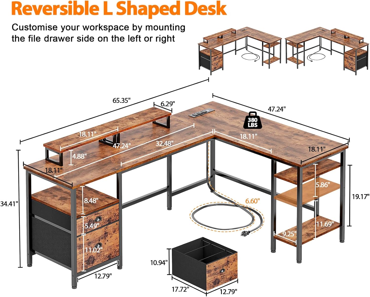 Upgraded Fabric File Drawer: The l shaped desk with a fabric drawer and file cabinet, 2 tier storage shelves, allowing you hold letter/A4/ legal size files. Drawers made of high-quality non-woven fabric that is lightweight, breathable and prevent dust.