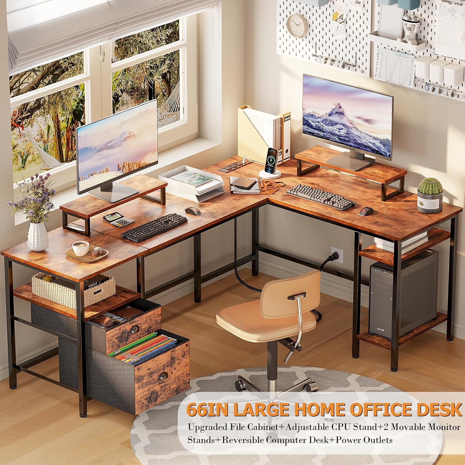 Furologee Desk with Power Outlets + 2 Monitor Stands+File Drawer+Storage Shelves+Extra Long