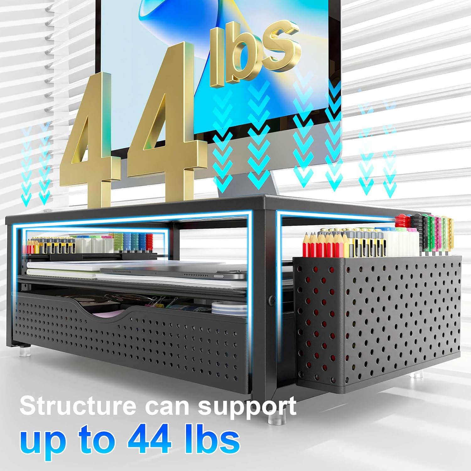 【Improved Work Efficiency】: The monitor riser comes with a sliding drawer and two pen holders. It accommodates various office desk items, saving space. It helps you quickly identify the contents of each compartment, doubling your work speed.