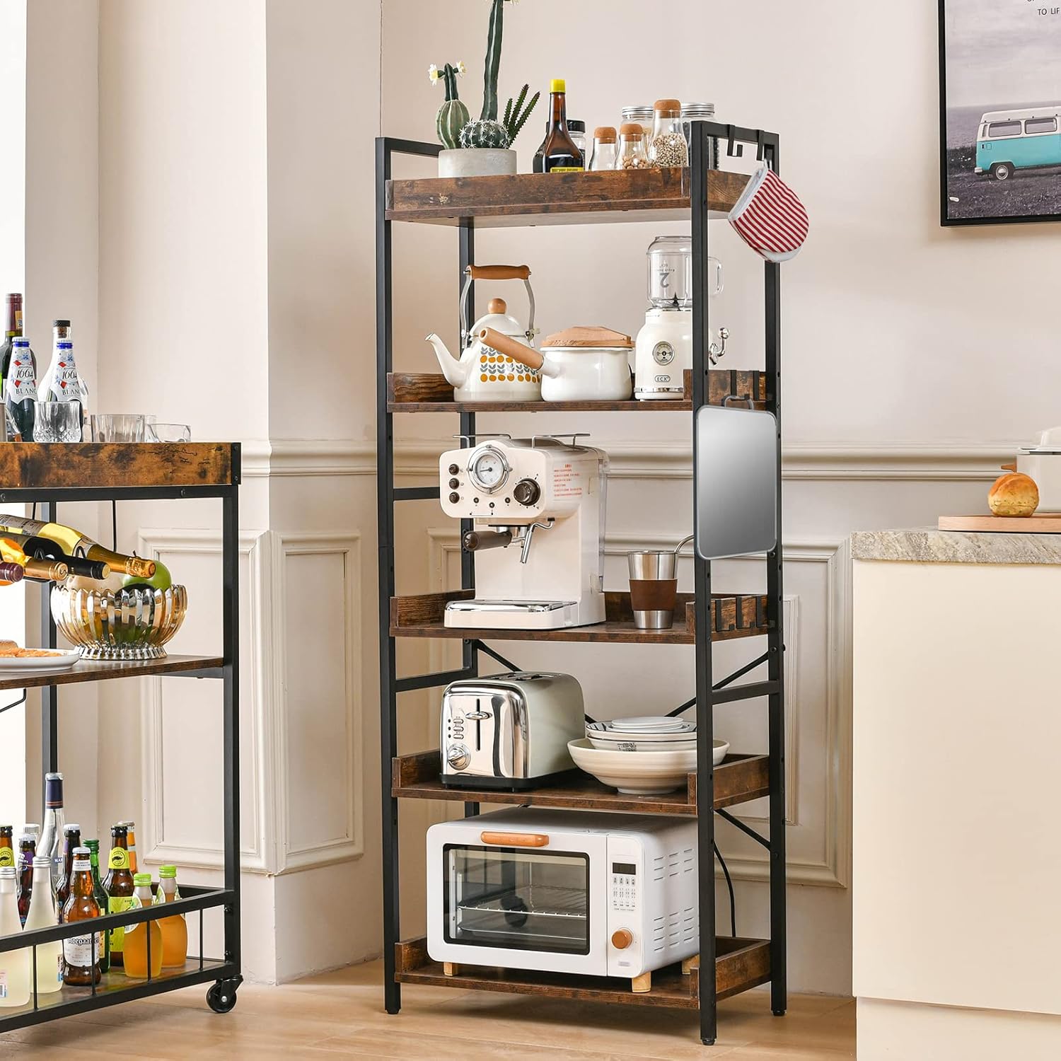 【8 Storage Hooks & Anti-Falling】The 5 tier bookshelf have different iron frame designs on each side, providing versatile storage options for products of various heights including books and ornaments. Additionally, 8 multipurpose hooks are included to hang headphones, toys, or other small decor.