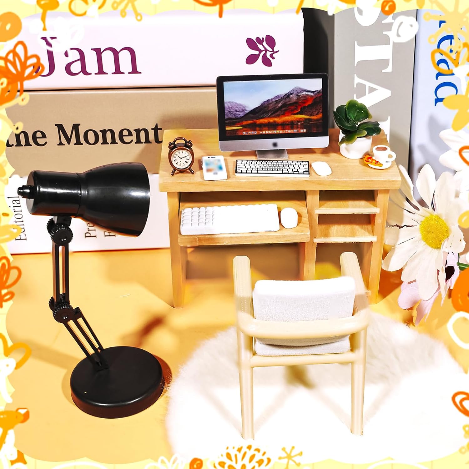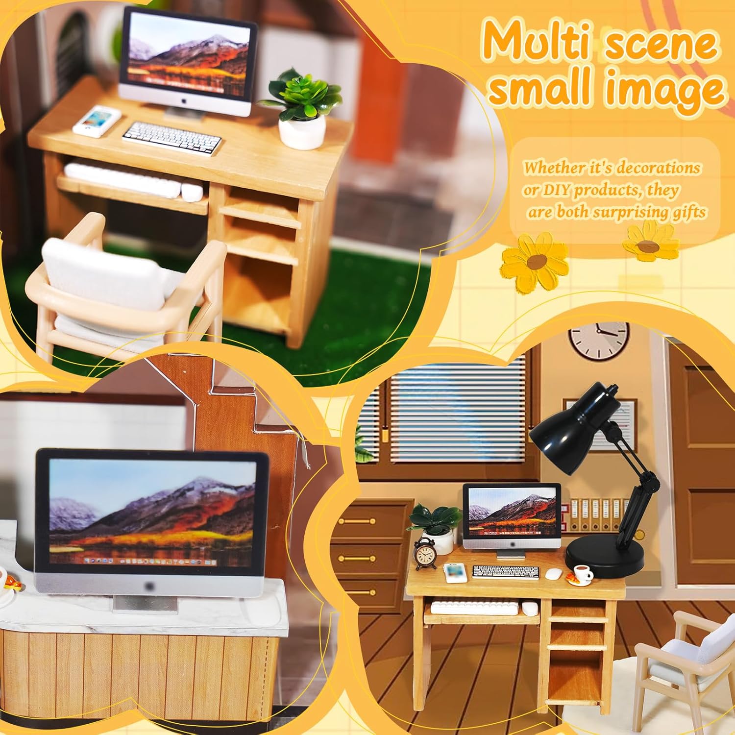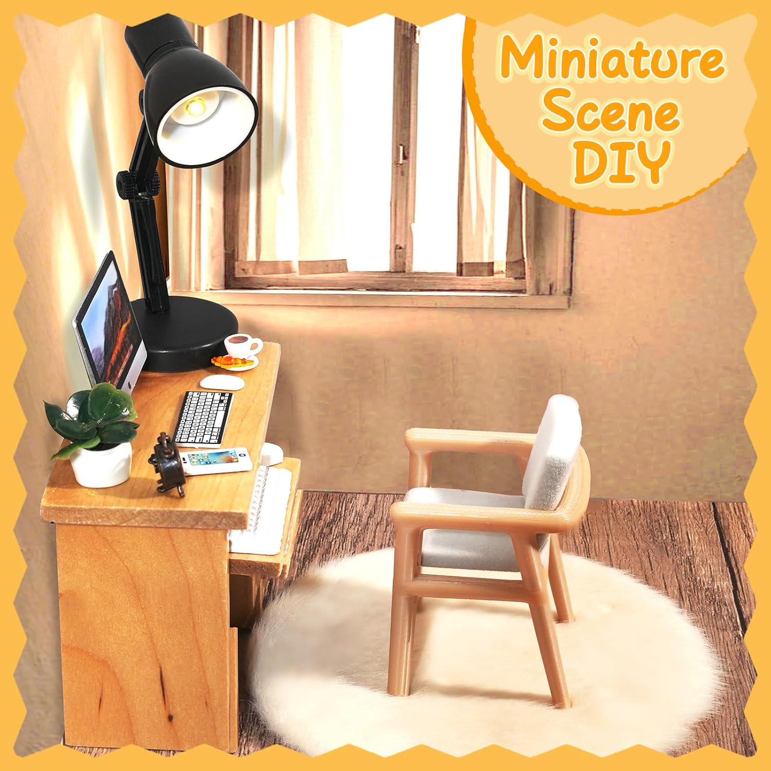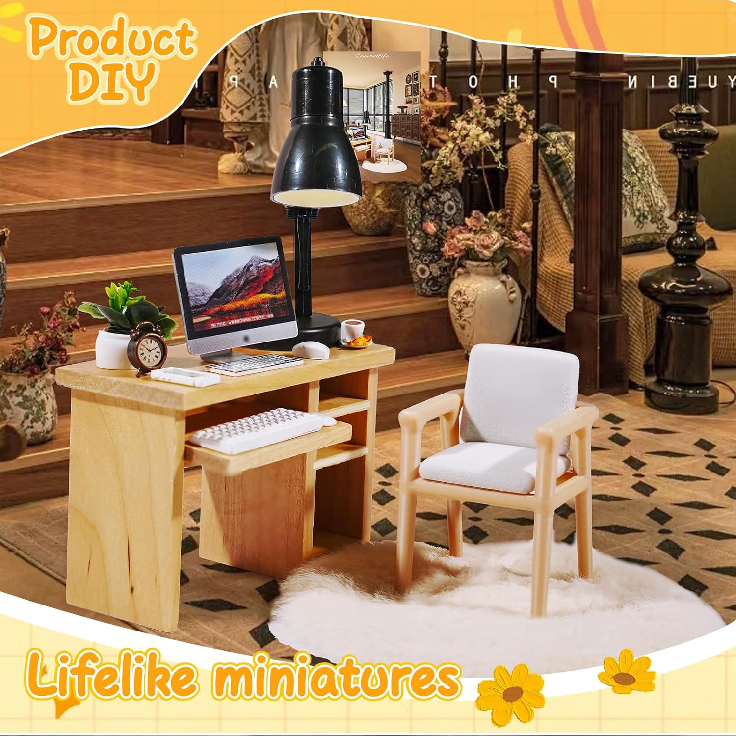 PACKAGE LIST: 1 miniature desk and chair, 1 mini carpet, 1 desktop computer with mouse keyboard, 1 mini phone, 1 miniature alarm clock, 1 mini desk lamp, 1 mini plant, 1 coffee cup. The enough quantity and kinds are sufficient to meet your use and decoration needs.