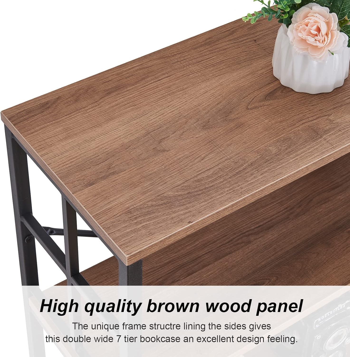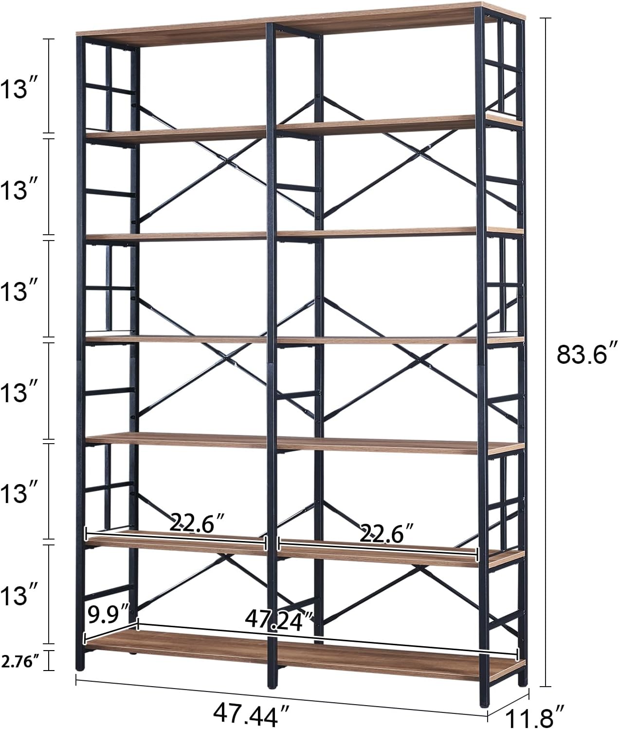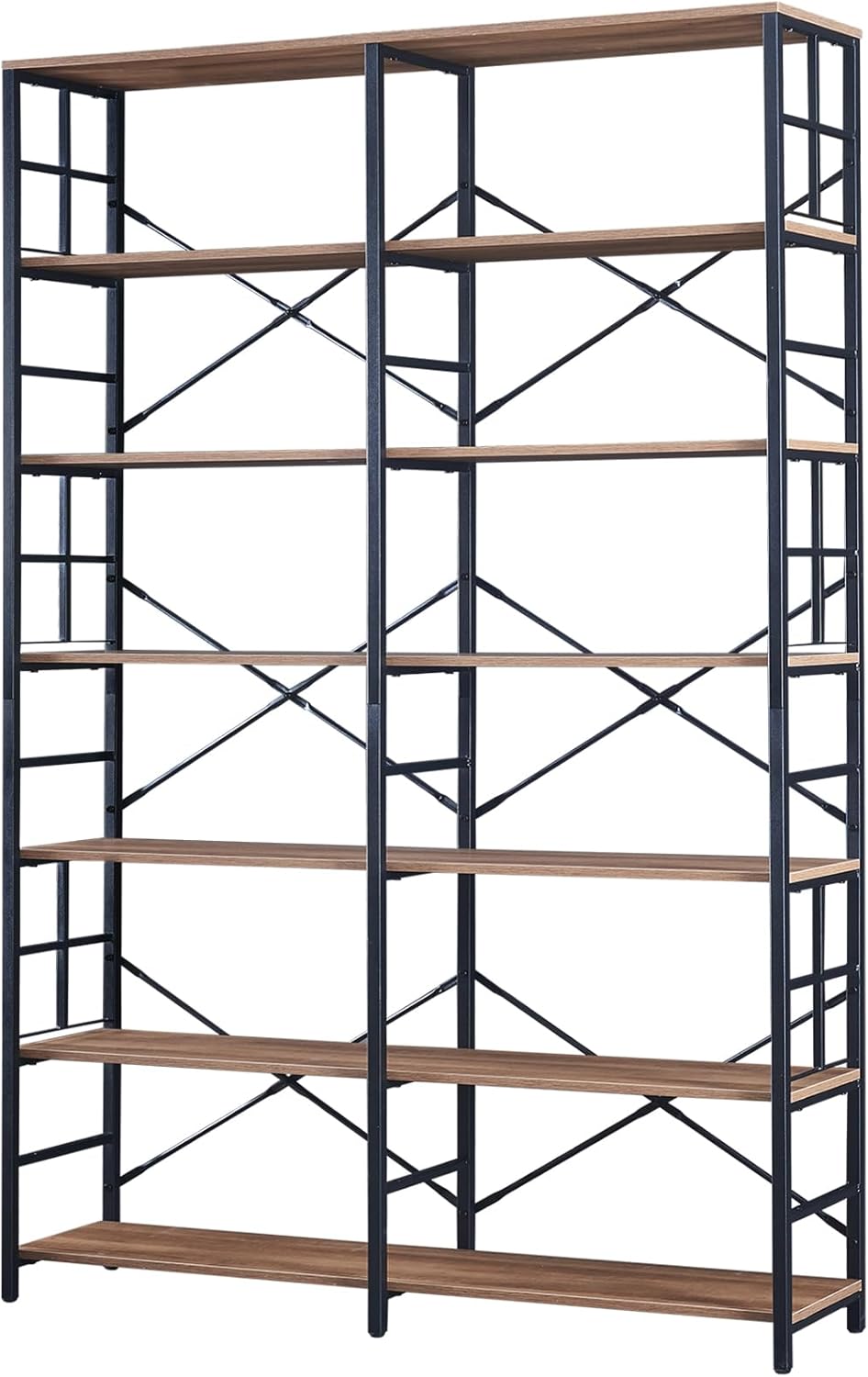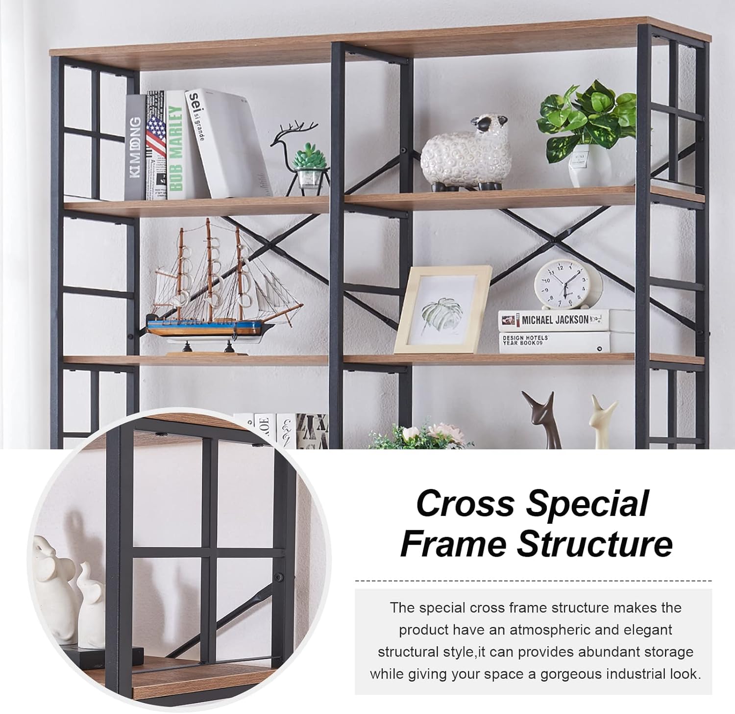[Retro Industrial Design]This product adopts a minimalist design style, using a combination of iron frames and panels, making the product full of vintage and industrial colors.[Safe and Reliable Materials]The use of X-shaped support and locking wall components are able to provide security to the product.[Crossed Frames]Special frame structure processing,with decorative items, books so that the double wide bookshelf can become a piece of art for your family.
