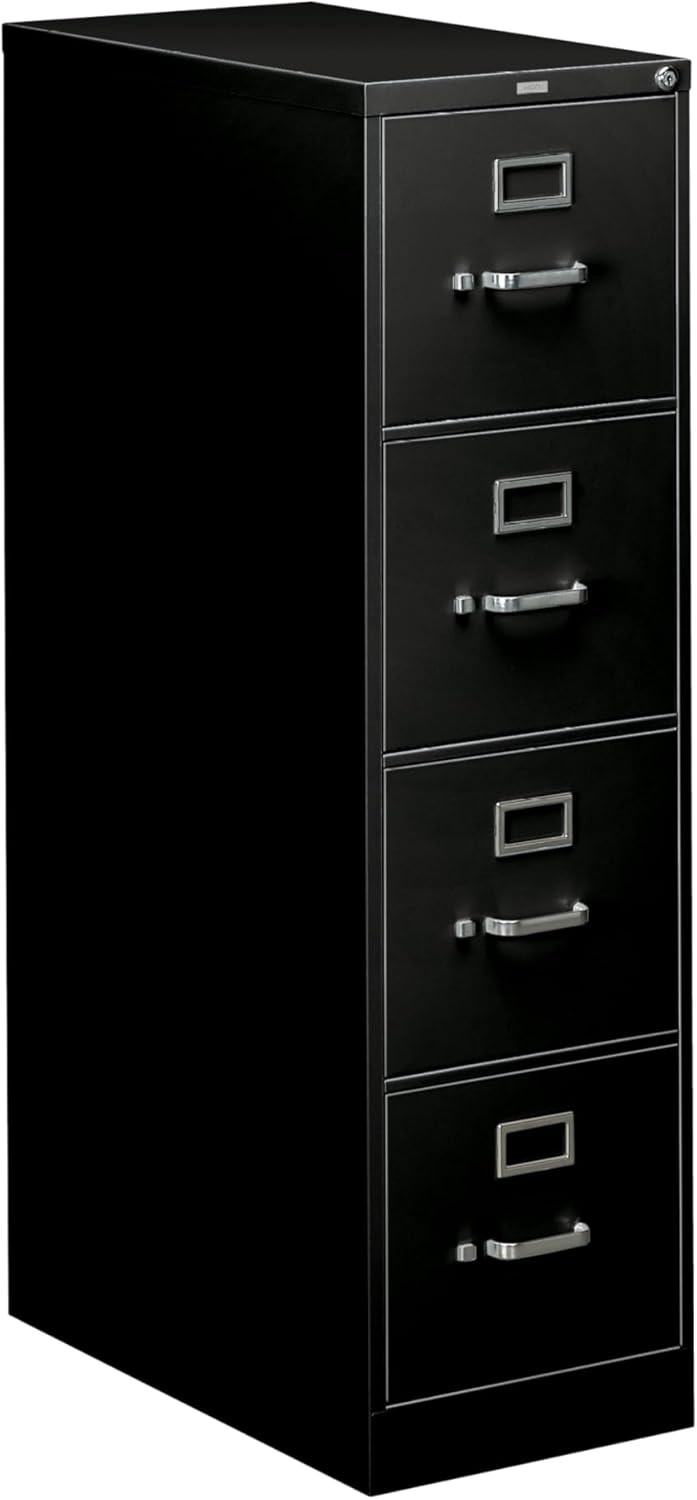 The HON 4-Drawer Letter File is a top-tier 4 drawer file cabinet designed to keep your high-security documents safe. Constructed from solid steel with vertical reinforcements and a double-walled front kickplate, this vertical file cabinet ensures durability and protection. The replaceable locks feature of this locking file cabinet means you can swap out the locks whenever necessary for added security. Our commercial-grade office file cabinets are built for smooth and quiet operation, thanks to ball-bearing full-suspension drawers and thumb latches that keep drawers firmly shut. The office cabinet design offers high drawer sides to support hanging file folders and label holders for easy document retrieval. Measuring 26.5 inches in depth, 52 inches in height, and 15 inches in width, this metal storage cabinet can accommodate a substantial amount of paperwork. Built by America’s filing leader, the HON 310 Series ensures longevity, backed by continuous quality testing and a Full Lifetime Warranty. The clean visual design of this office file cabinet blends seamlessly into any office space. Offering 25 filing inches per drawer, the file folder cabinet also features a brushed aluminum label holder and high drawer sides for additional hanging file support. Proudly made in the USA, this vertical filing cabinet provides reliable and efficient storage for years to come.