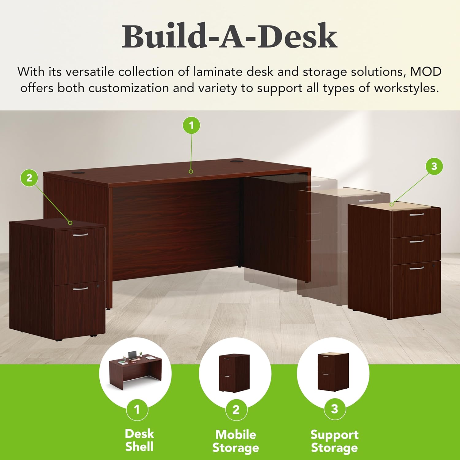 QUICK & EASY ASSEMBLY: Home office desk table ships in one box and assembles in no-time with a simple metal-to-metal fastening system for precise fit and unsurpassed durability – Compatible with MOD Hanging or Support Pedestals for smart storage options