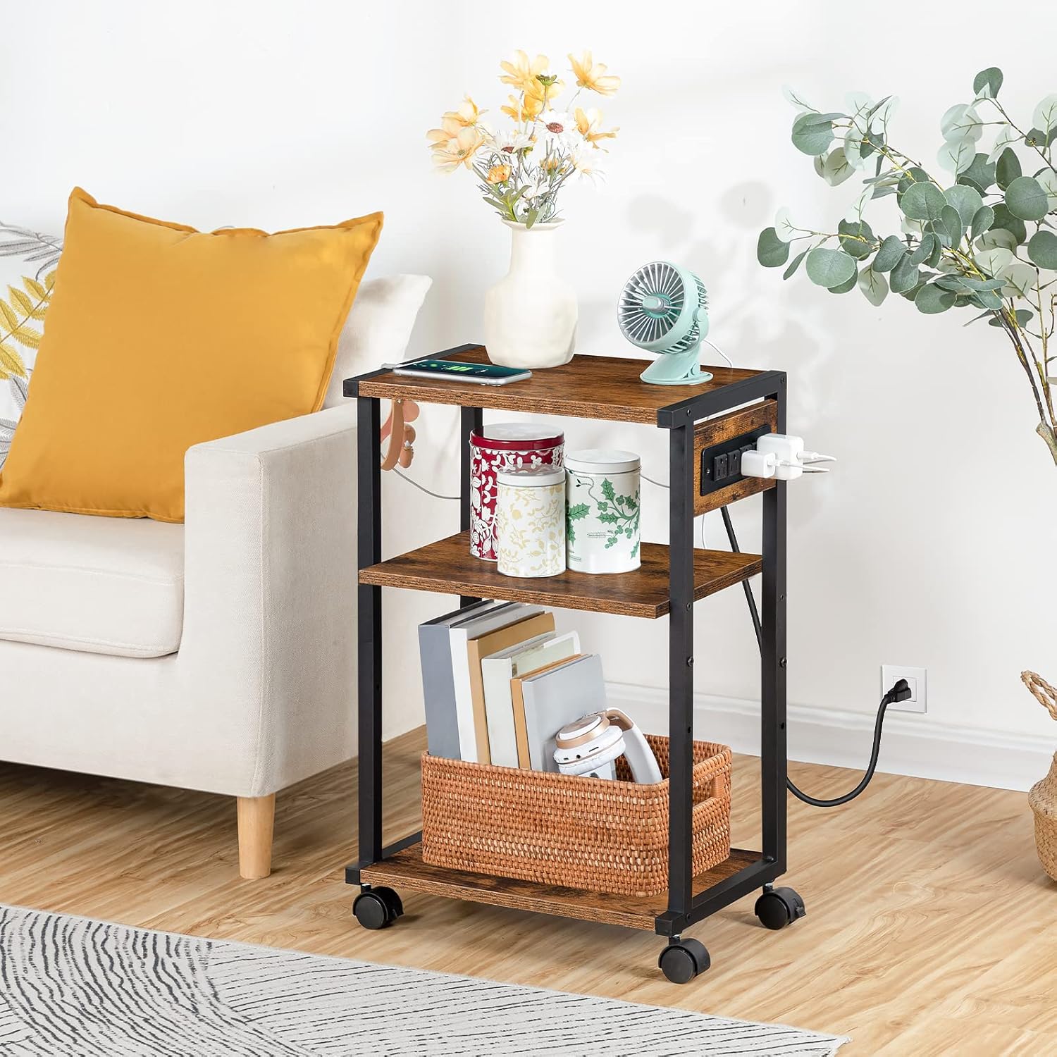 Printer Stand with Charging Station: This printer stand is equipped with one power board and 4.9ft long power cord on the side. Four 3-prong sockets make it actual to charge multiple devices simultaneously