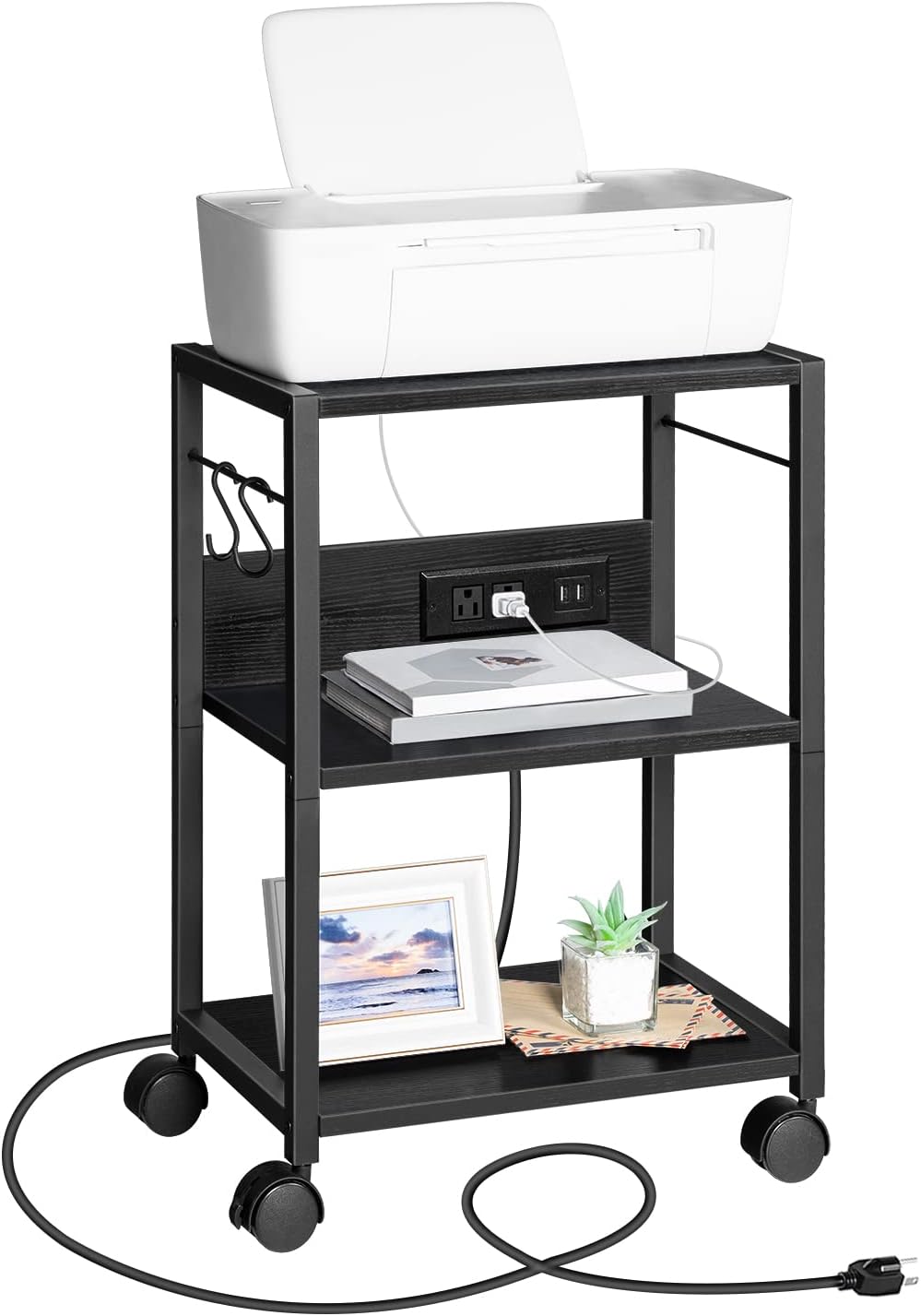 Printer Stand with Power Outlets: Engineered wood and thickened metal frame form a strong and stable printer table . Printer stand with storage is Equipped with a charging station consisting of a 150cm power cord, 2 USB ports and 2 three-prong outlets, it can easily charge electronic devices such as printers, mobile phones and camera