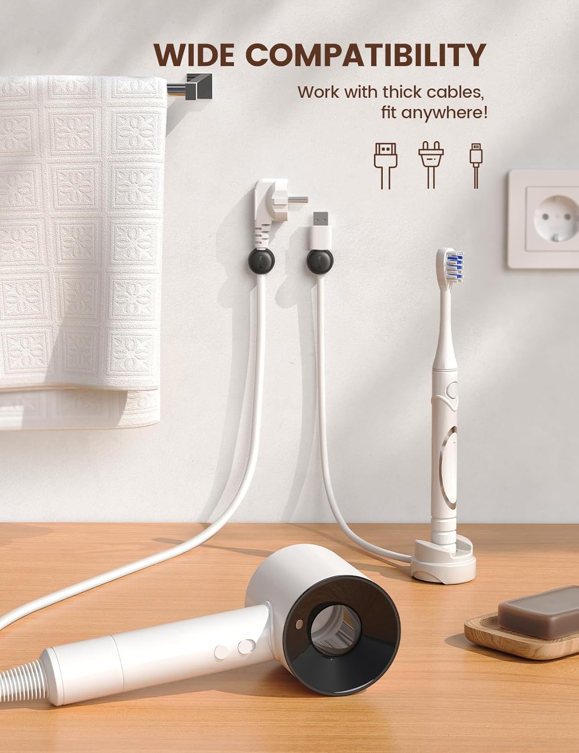 [Auto Close Spring Locking] Our cord holder clips are equipped with a spring open-close mechanism that combines a 60° rotation shaft and a thoughtfully angled opening. This cord holder organizer allow you to place and remove your phone charging cords, HDMI cords, household wires qucikly and securely – using just one hand! [Installaiton Tip] Please wait 30 minutes after sticking the cord holders to let the adhesive fully set