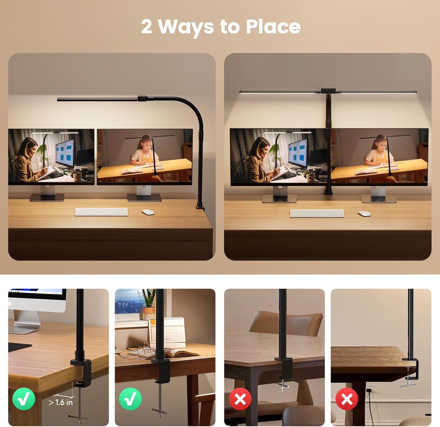 【Flexible Lamp Head & Ultra Wide Coverage】This computer desk lamp, designed with 2 light bars, 30in long, 0-180°extension, rotate 0-180°up and down, so it can provide enough light for the whole desk. And the the gooseneck can be adjusted to any direction and position you like.