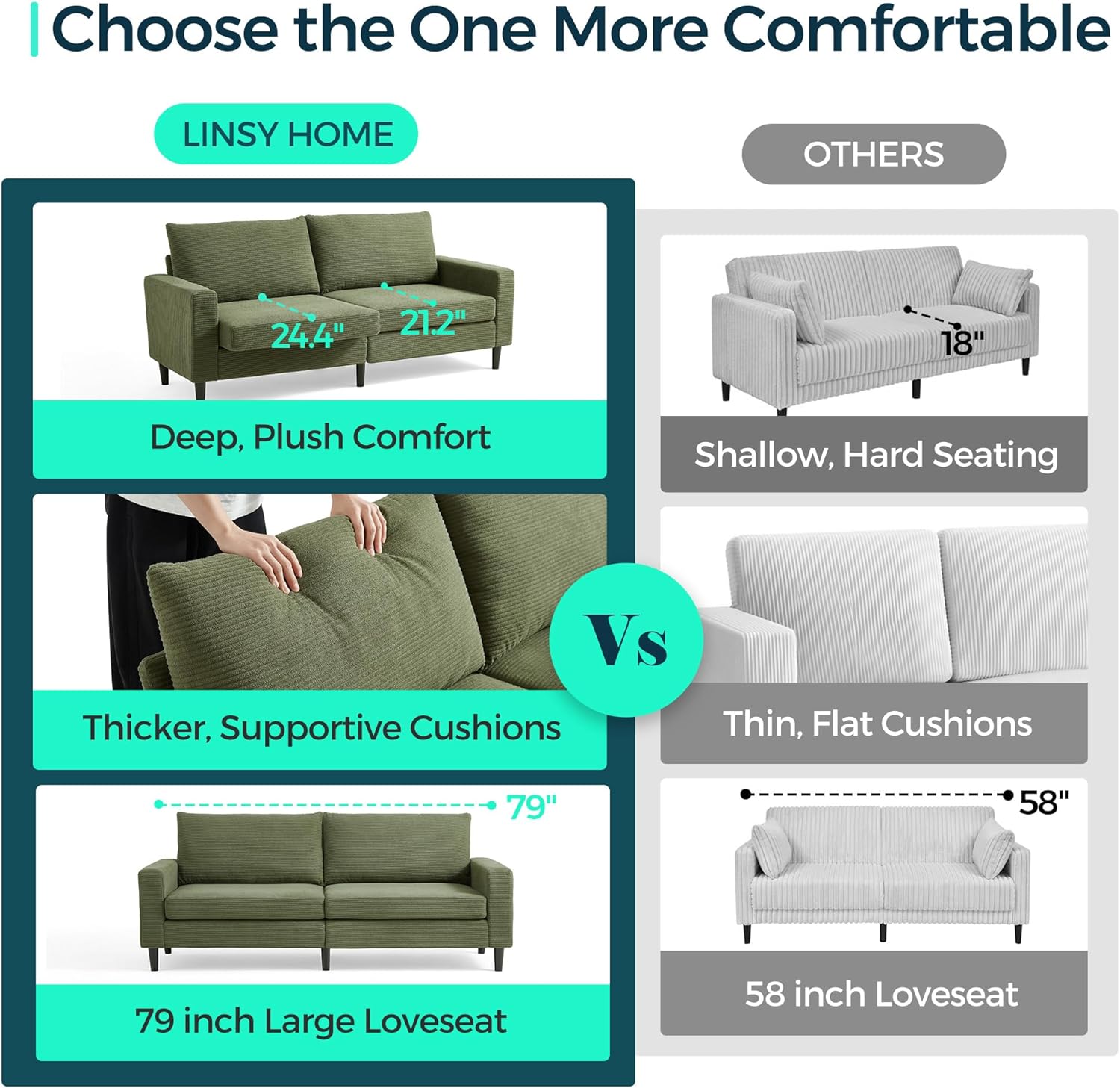 Spacious and Comfortable: Our 79-inch love seat offers spacious and comfortable seating compared to other loveseats. Its spacious design is perfect for two or three people to sit side by side, giving you extra room to stretch out while you relax