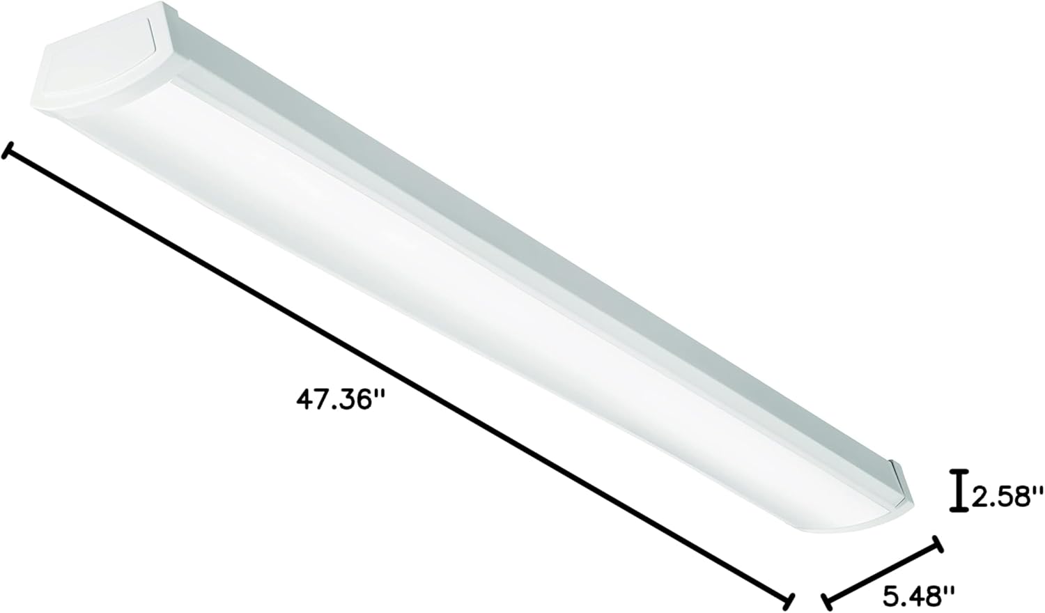 The Lithonia Lighting FMLWL LED linear wraparound is a versatile ceiling light designed to provide bright, even illumination in hallways, offices, closets, and utility areas. The ceiling light fixture is great meets many home lighting needs: it can be a closet light, LED garage light, bathroom ceiling light, or kitchen light. This low-maintenance fixture delivers 3,000 lumens of 4000K cool white light with a long-lasting LED engine, ensuring up to 50,000 hours of energy-efficient performance. Its durable construction features a sturdy metal housing with decorative plastic end caps and a white polycarbonate diffuser that distributes light evenly while reducing glare. Designed for convenience, this light fixture supports easy surface-mount installation on ceilings or walls, making it suitable for both residential and commercial spaces. The 4 ft. LED light is UL and CSA listed, and rated for damp locations, ensuring safe operation in various environments. Measuring 47.5″ x 5.5″ x 2.6″ and operating at 120V, it offers a reliable lighting solution backed by a 5-year limited warranty for long-term peace of mind.