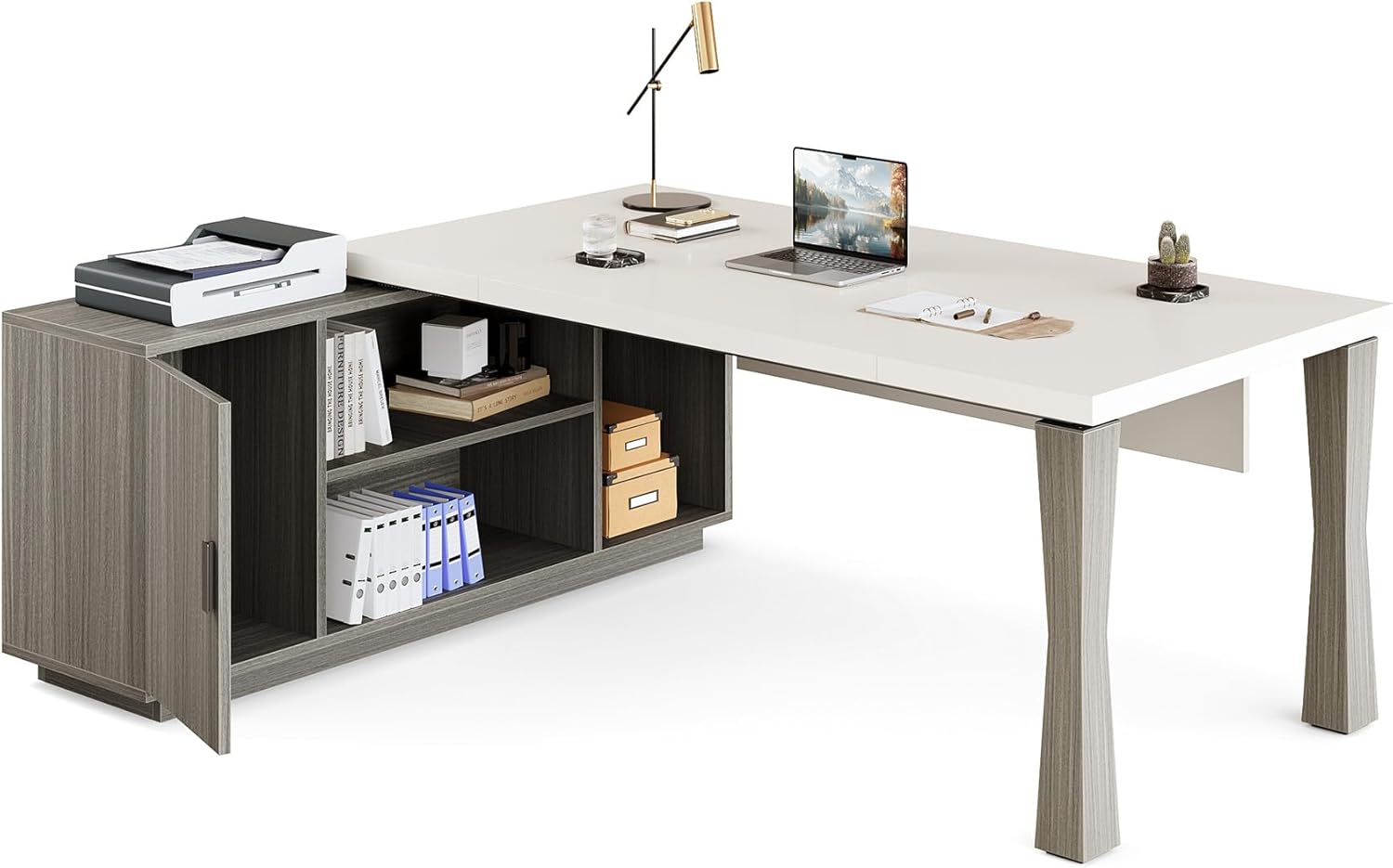 Upgraded Large Executive Desk: This desk is outfitted with a host of features such as a storage cabinet, printer station, CPU holder, and open shelves. The versatility of this L-shaped desk allows it to double up as a workstation, study table, gaming desk
