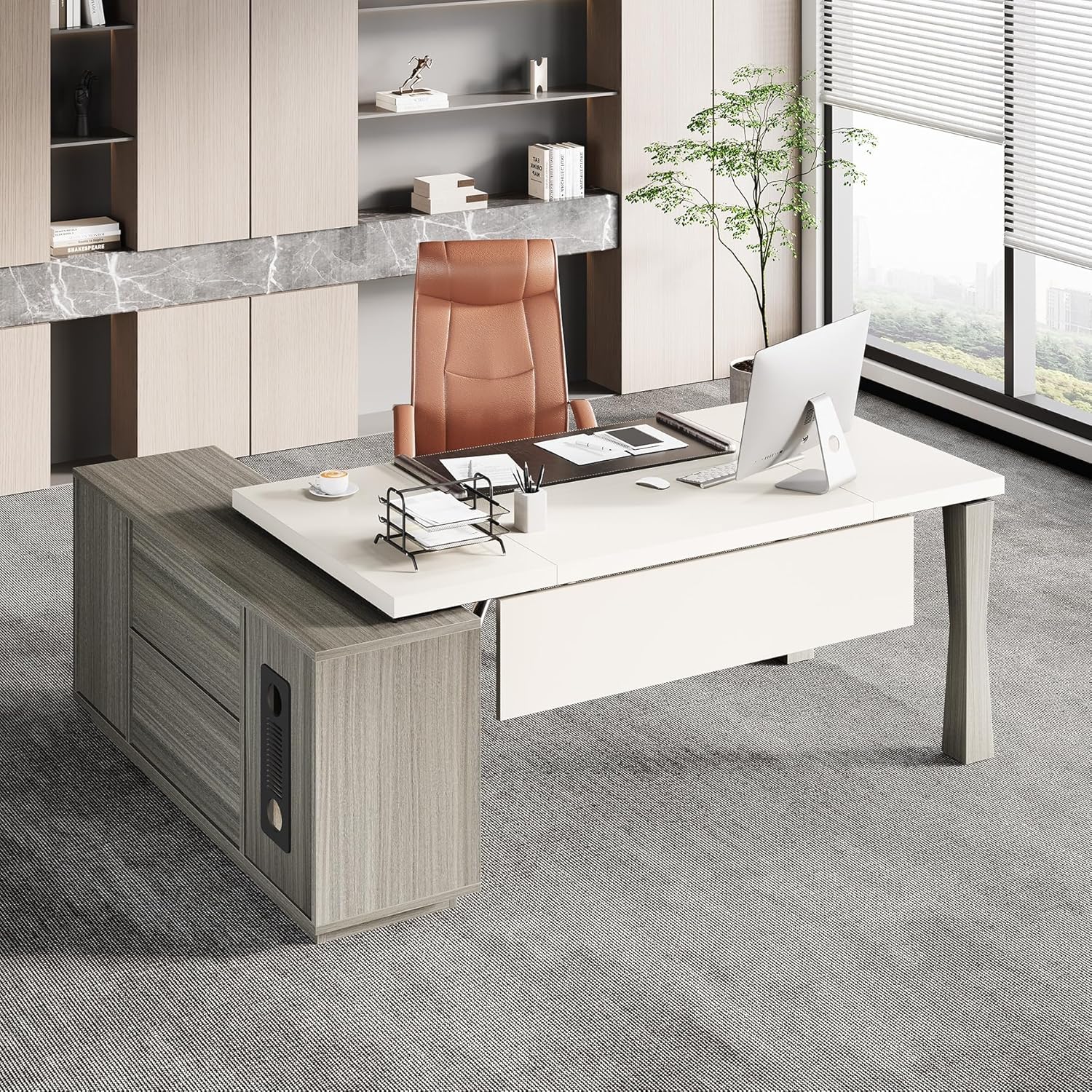 LITTLE TREE Large Executive Desk Desk with File Cabinet