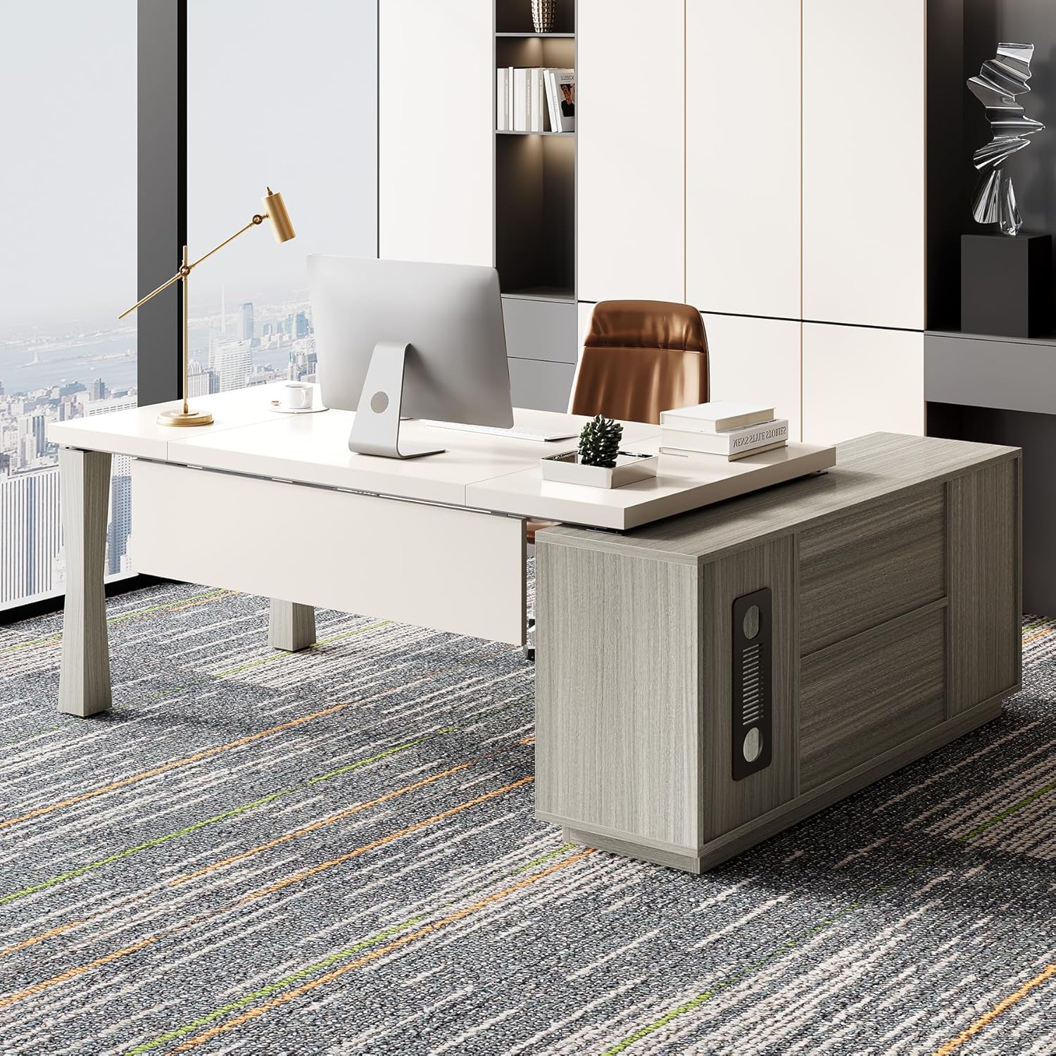 Reversible Storage Cabinet: This large executive desk features a reversible storage cabinet that you can position on either the left or right side. It helps maximize the organization of documents, stationery, and personal items