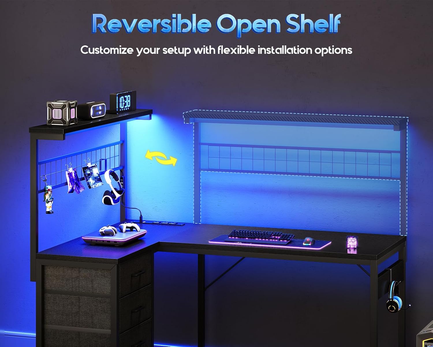 【Reversible L Shape Desk】This L shaped desk comes with storage shelves, drawers, grid pegboard, power outlet, light strip and headphone hook. The L desk is reversible and the top hutch can be fixed on the left or right side according to your needs, maximizing your limited space and ideal for corner spaces. A great choice for home office, game, office, studio and living room.