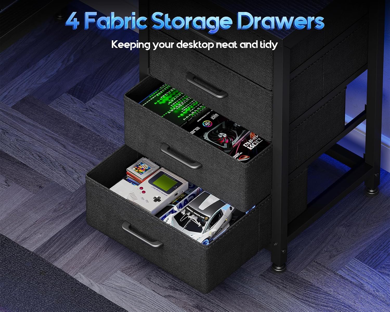 【Ample Storage Space】Dimension: 17.7″D x 43″W x 29.8″H. The L-shaped desk provides 4 drawers, grid pegboard, shelf and headphone hook, which gives you super plenty of storage space to store your game items, work files and small office stuffs, make your desktop clean and tidy.