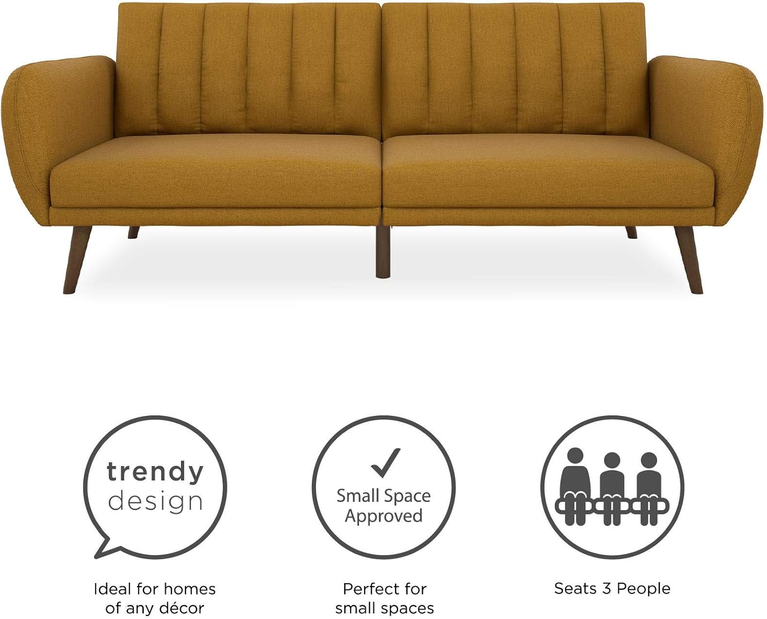 Featuring a Mid-Century Modern design with a ribbed tufted backrest, curved armrests, and slanted wood legs, this futon couch is excellent for a living room, home office, or small bedroom couch