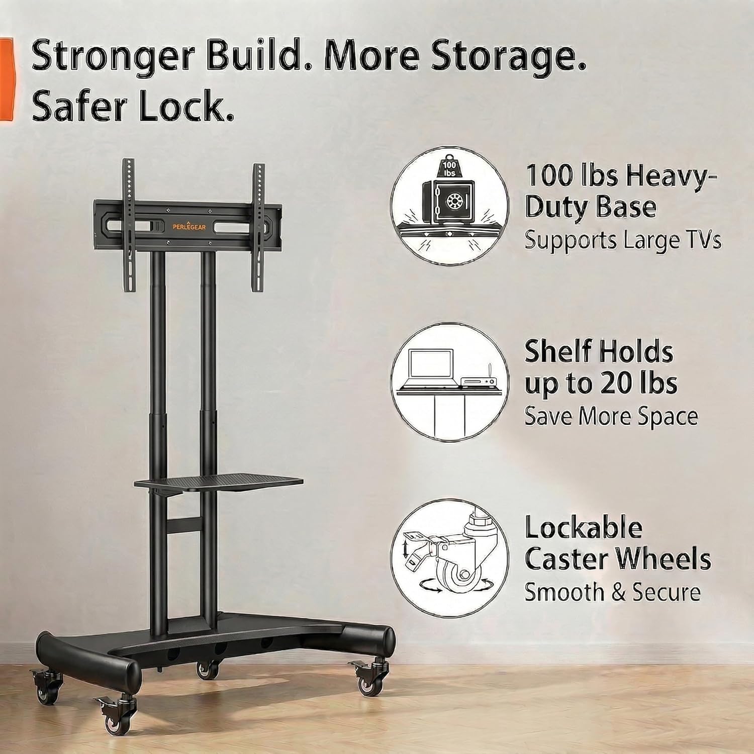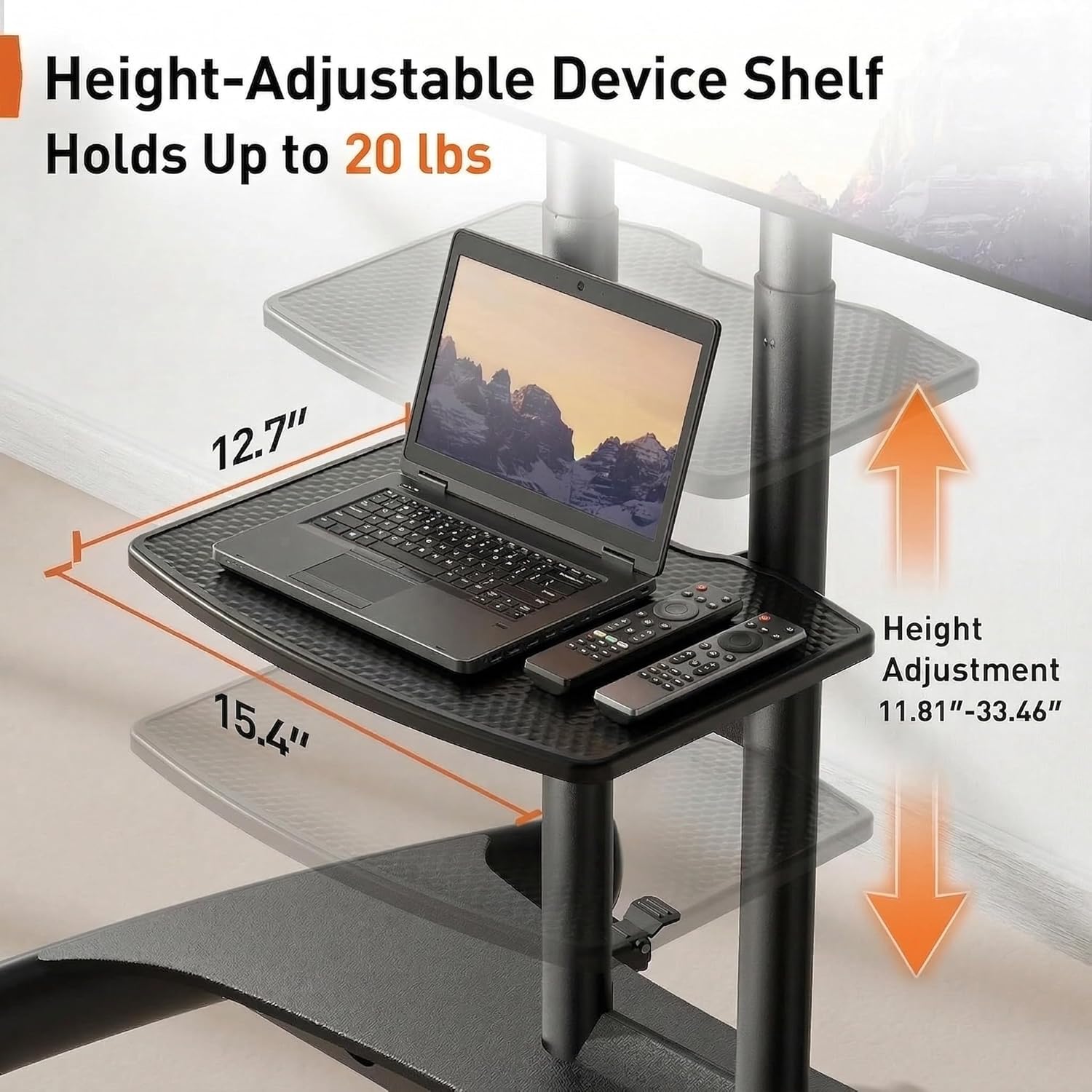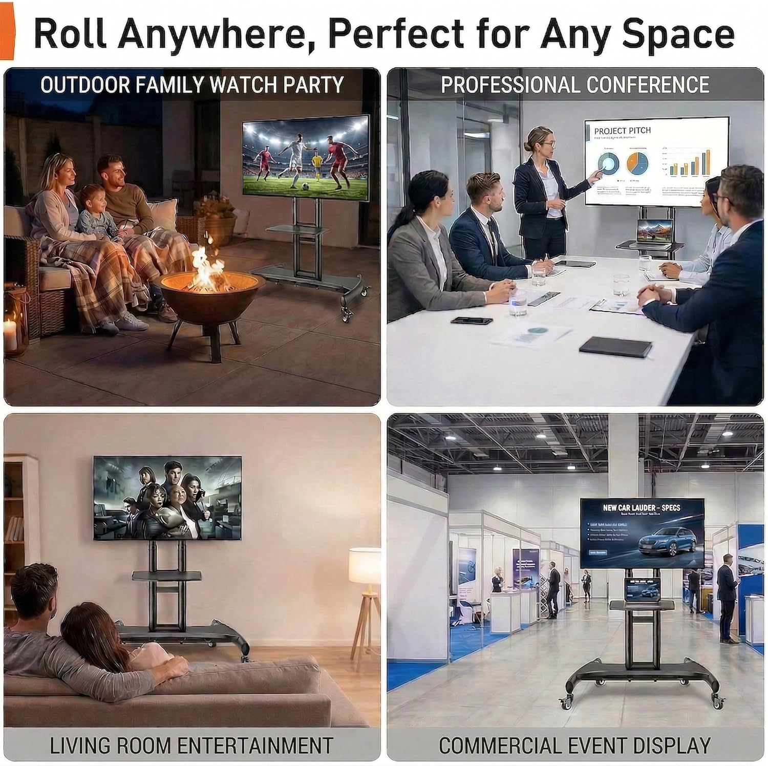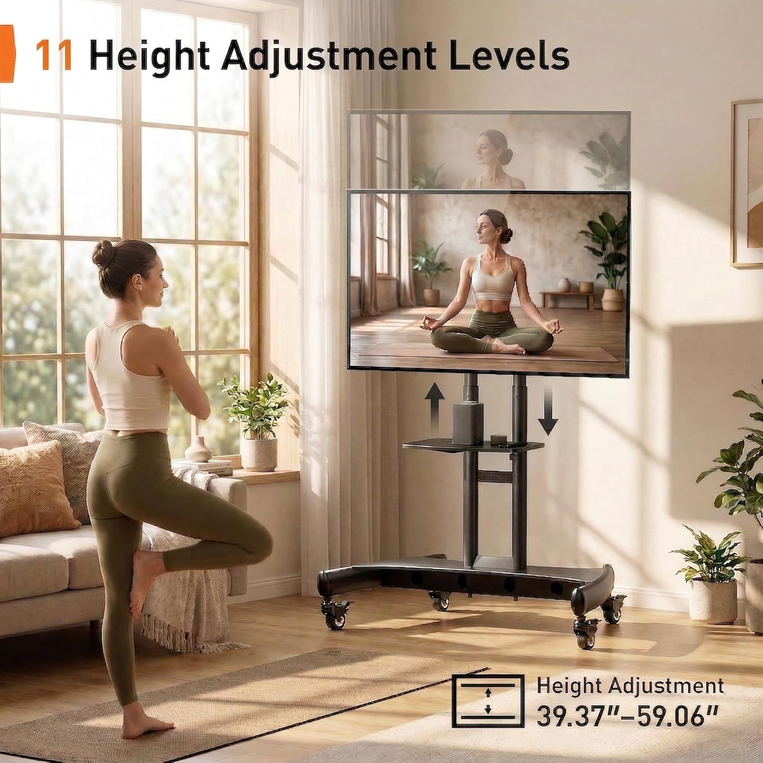 [Versatile] This rolling TV stand is absolutely an innovation in TV mounting. Perfect for those who have tight quarters and don’t want their TV dominate the room. For those with spacious living space, it’s bravo too as you can move it room to room. Ideal mobile monitor display choice for workout room, office, school, shopping mall, airport, etc. You can mount your gaming devices as well for a mad cool gaming system.