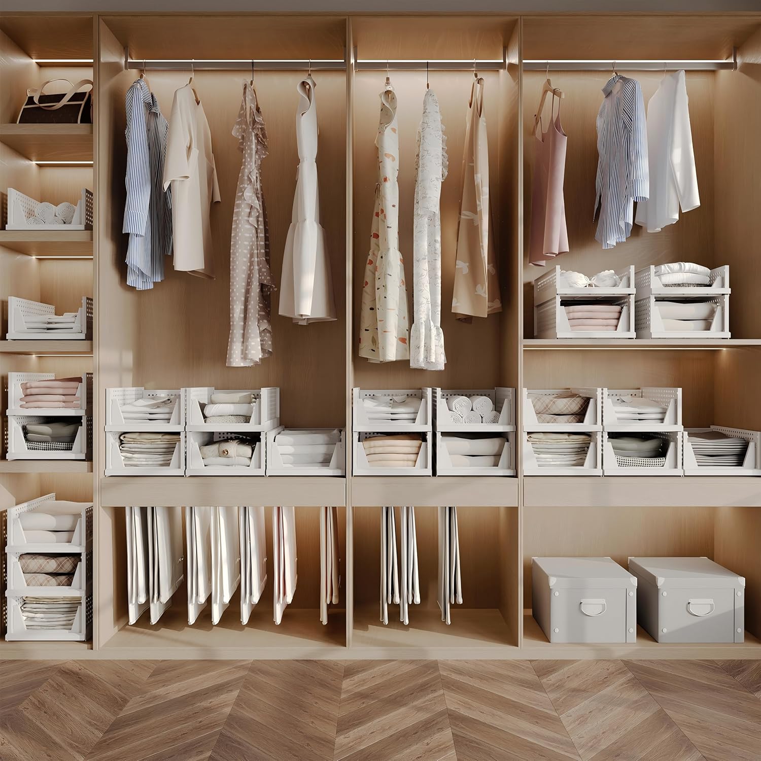 【Assembly Easily & Stackable】: Easy to set up, follow the steps in pictures. Adjust to your own liking by stacking the perfect number to fit your own space. Set of 5 wardrobe clothes organizer can be stackable which make home space organized, max the use of vertical space. You can stack multi-layer wardrobe storage organizer according to your needs freely. Dimensions of each when set up: 1 pack:16.6″ x 13.1″ x 7.32″ (L x W x H), 5 pack:16.6″ x 13.1″ x 35.4″ (L x W x H).