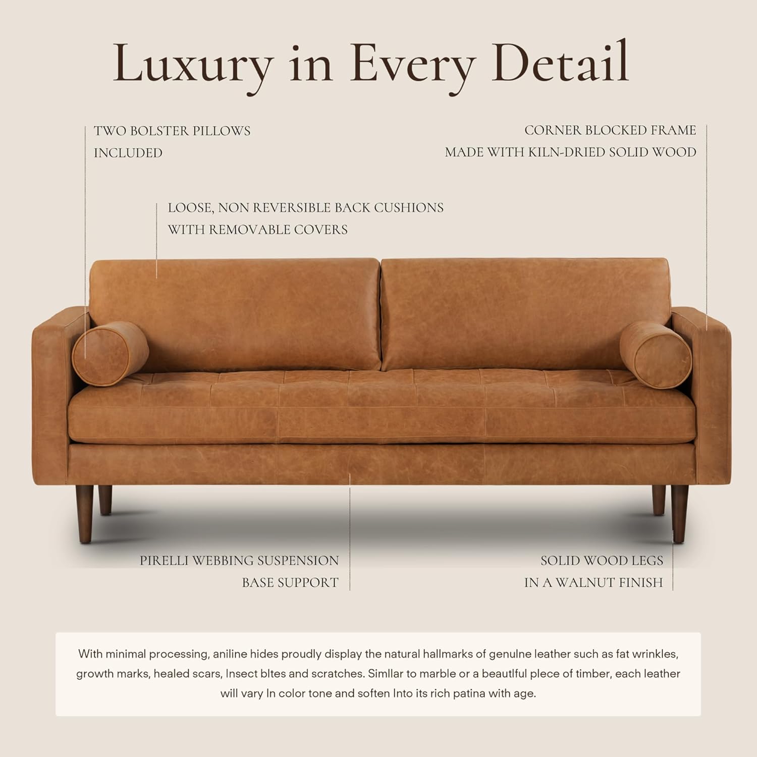 Quality First Because Quality Lasts: Our full-grain pure-aniline Italian leather sofa is designed with your comfort in mind, featuring a feather-down topper on seating surfaces, webbing support, and two loose bolsters. Its solid wood legs with a walnut finish complement the cognac tan, making it an ideal office sofa or living room sofa.