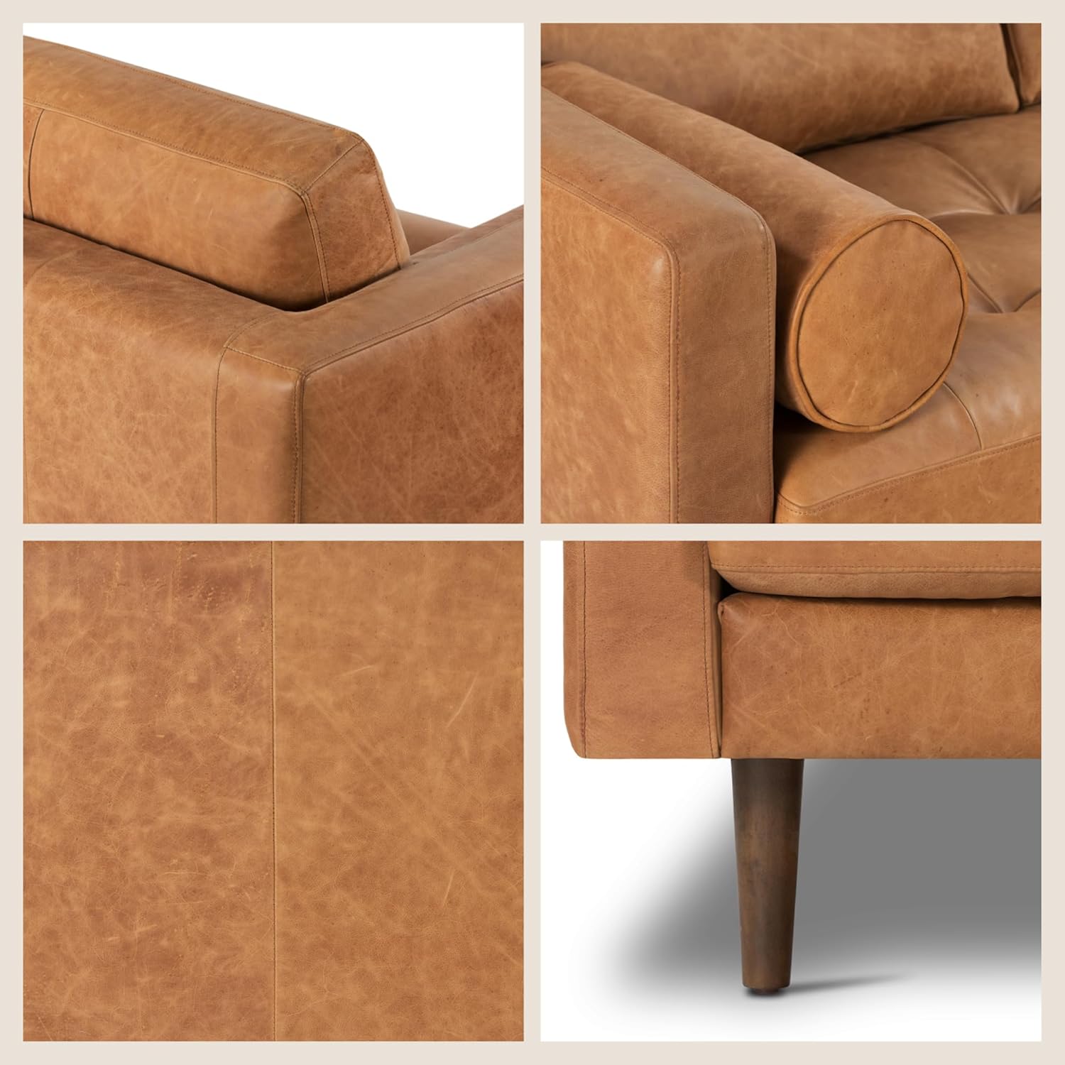 Trend Proof Your Home: Our leather sofas made for your living room come in a timeless cognac tan color that highlights the natural beauty of the hide. Each couch leather stands out thanks to the genuine full-grain leather’s rich, natural variations in color making it a modern day classic.
