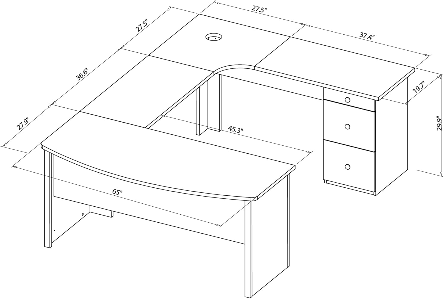 Give your corner office a style boost with this Realspace Broadstreet U-shaped desk. The 3 drawers provide storage for files and supplies, while the pullout keyboard tray allows for comfortable typing. A bridge connects the 2 spacious work surfaces, delivering abundant space for your computer, calendar and peripherals. This Realspace Broadstreet U-shaped desk boasts a flip-top hub for easy Ethernet, telephone and power access.