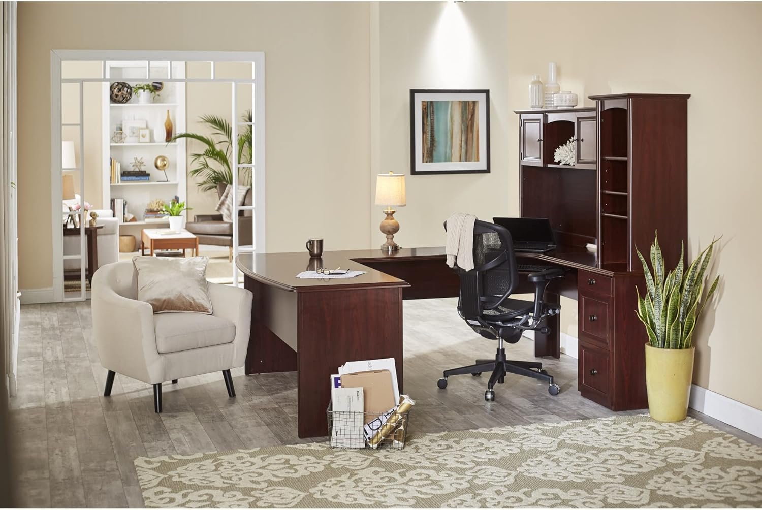 Give your corner office a style boost with this Realspace Broadstreet U-shaped desk. The 3 drawers provide storage for files and supplies, while the pullout keyboard tray allows for comfortable typing. A bridge connects the 2 spacious work surfaces, delivering abundant space for your computer, calendar and peripherals. This Realspace Broadstreet U-shaped desk boasts a flip-top hub for easy Ethernet, telephone and power access. Desktop boasts a laminate finish for durability. Slide-out keyboard drawer supports a comfortable typing position. 3 drawers provide flexible storage for paperwork and essentials. Assembly required. Finished in cherry. Tested to meet ANSI/BIFMA Performance Standards – Manufacturer testing has been conducted on this product to meet specific performance requirements and safety standards set forth by the American National Standards Institute (ANSI) and the Business and Institutional Furniture Manufacturers. This product is heavy and/or oversized and may need more than one person to handle. Interested in in-home assembly? Please call our certified and insured professional assemblers 866-388-4350 today!
