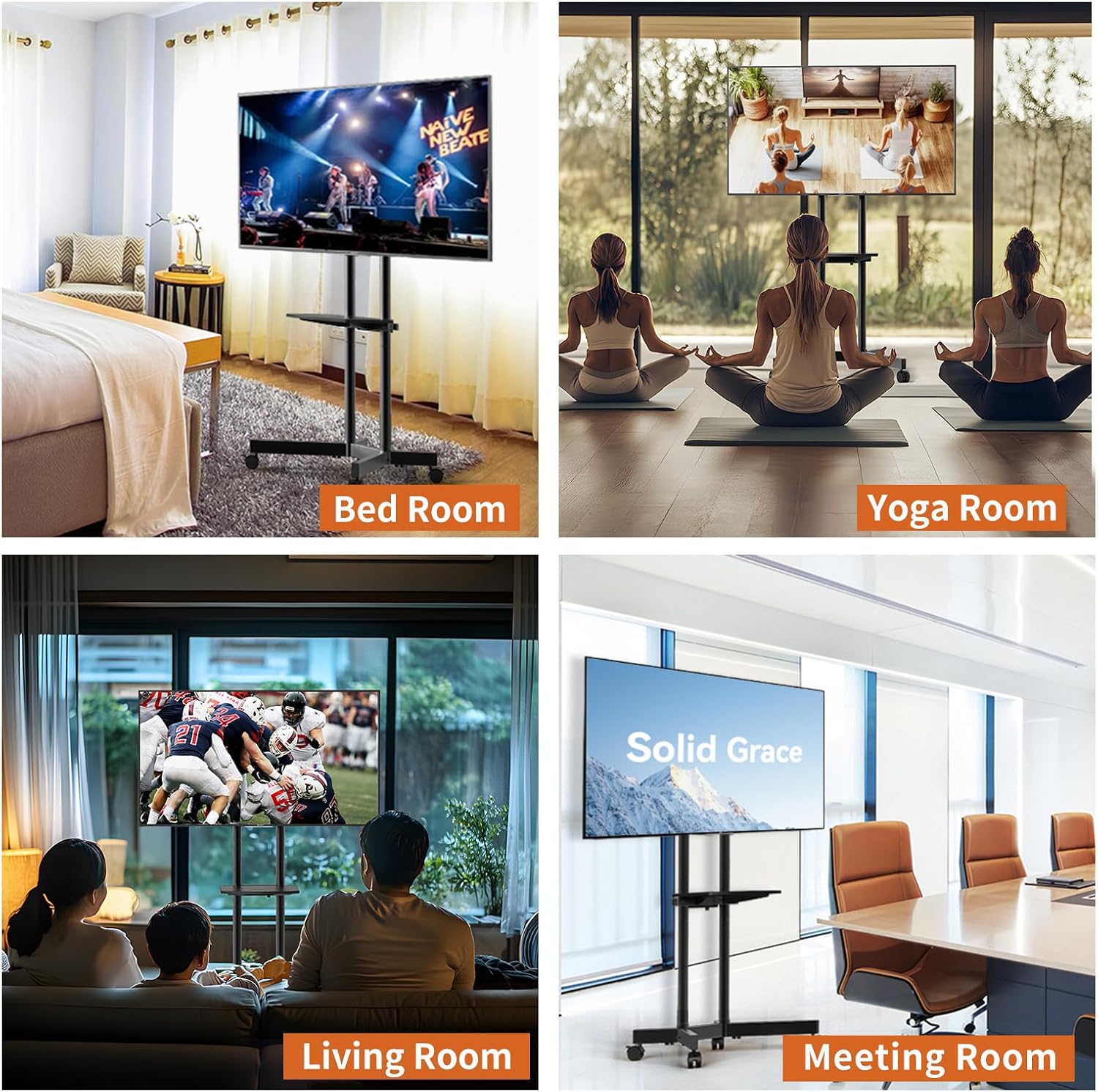 Rolling TV mount excellent stability: TV stand on wheels with high-carbon steel and dual-pole design, Mobility and stability are guaranteed, Additionally,the secure lock system design prevents accidents caused by TV falls