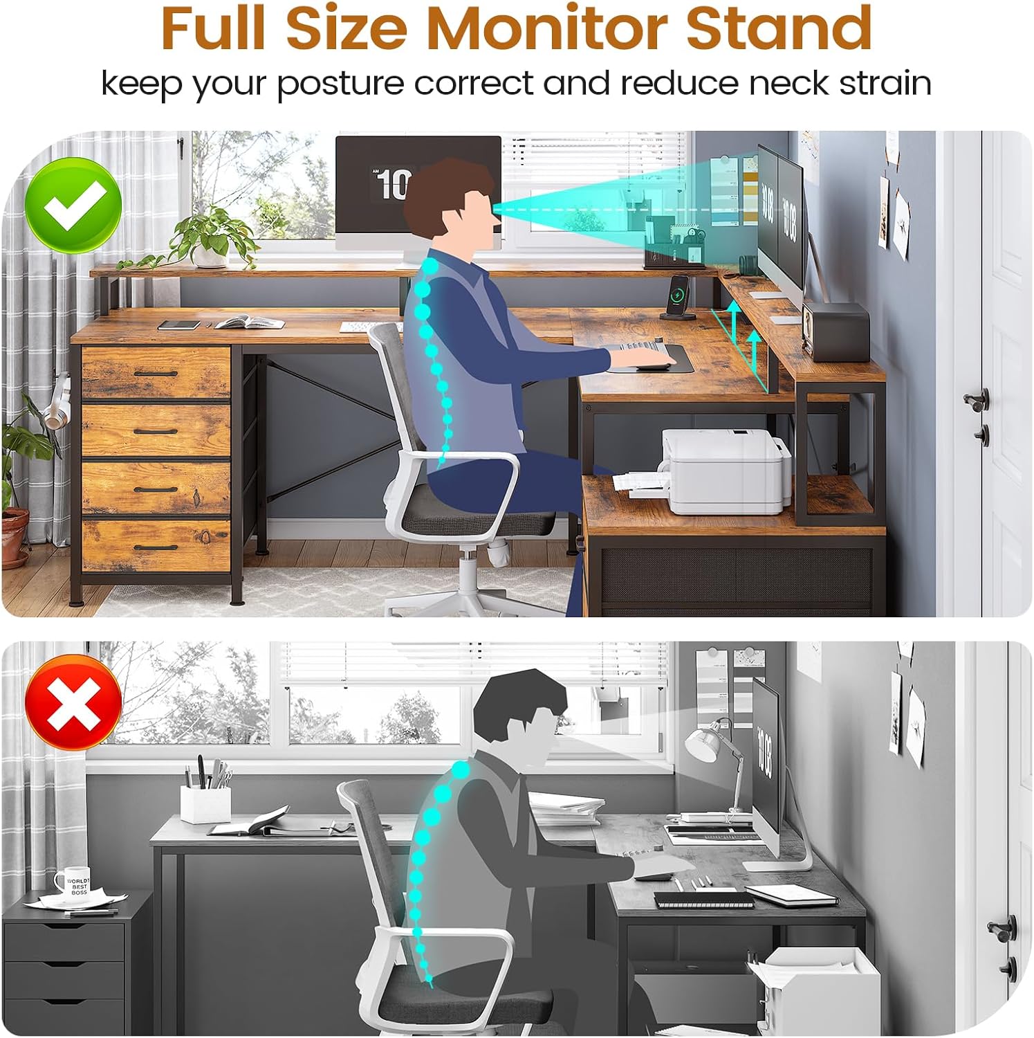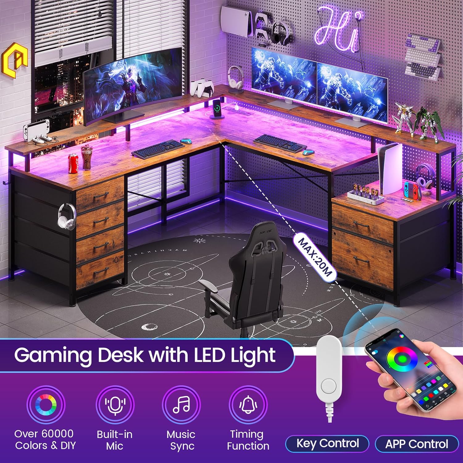 Elevated monitor shelf offers a ergonomic sitting positonStorage your objects in 6 fabric drawers, and file cabinet can hold letter/ A4/ legal filesLarge desktop make desktop tidy and clutter-freeCan charge mobile phones and computers at any timeCool & smart led light strips
