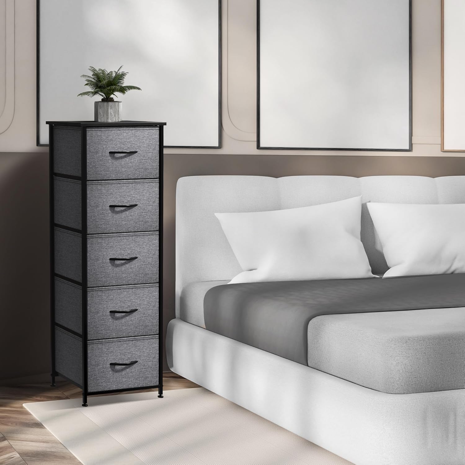 Spacious Storage: The 5 fabric drawers of the small dresser offer large storage space for nighttime necessities with Each drawer is approximately 8 inches deep. The wood top is ideal to place alarm clock, phone, charger, eyeglasses, keeping them in your reach.