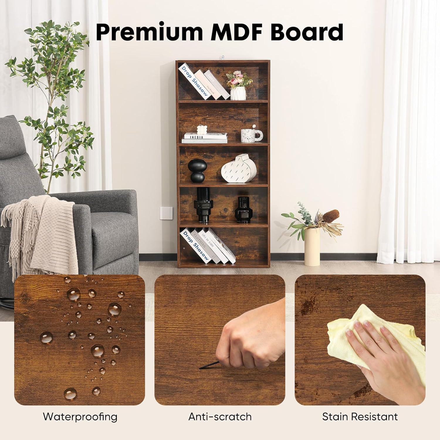 【Beautiful & Built to Last】Made from high-quality MDF that meets international safety standards, Sweetcrispy bookcase not only looks great with its realistic wood-grain finish – it’s also sturdy, reliable, and ready to blend into your home decor beautifully.