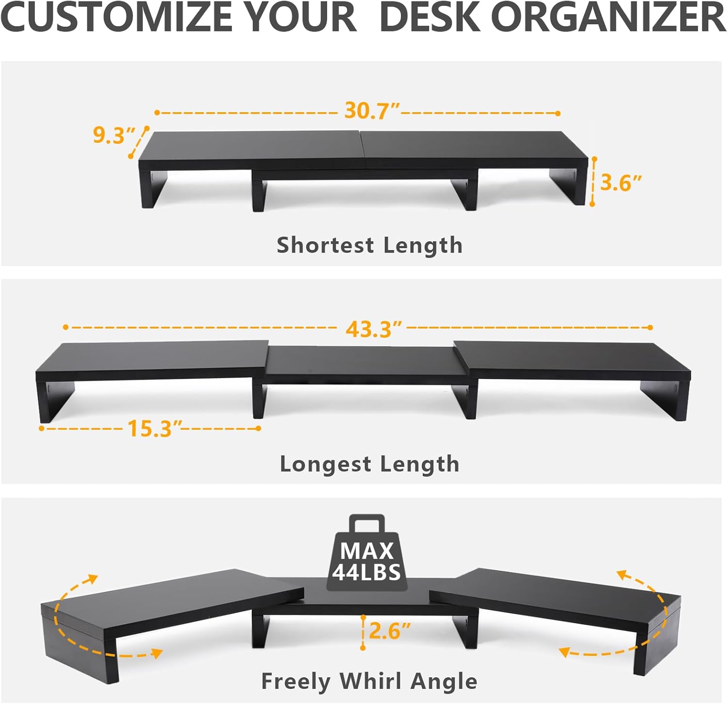 CUSTOMIZE YOUR OWN DESK ORGANIZER: Our desk monitor stand has adjustable length (30.7-43.3 inch) and angle, especially, the ability to change the angles of the end pieces. The desktop monitor stand can easily be moved adjusted to suit the curve of your monitors and fit smaller or larger desks!